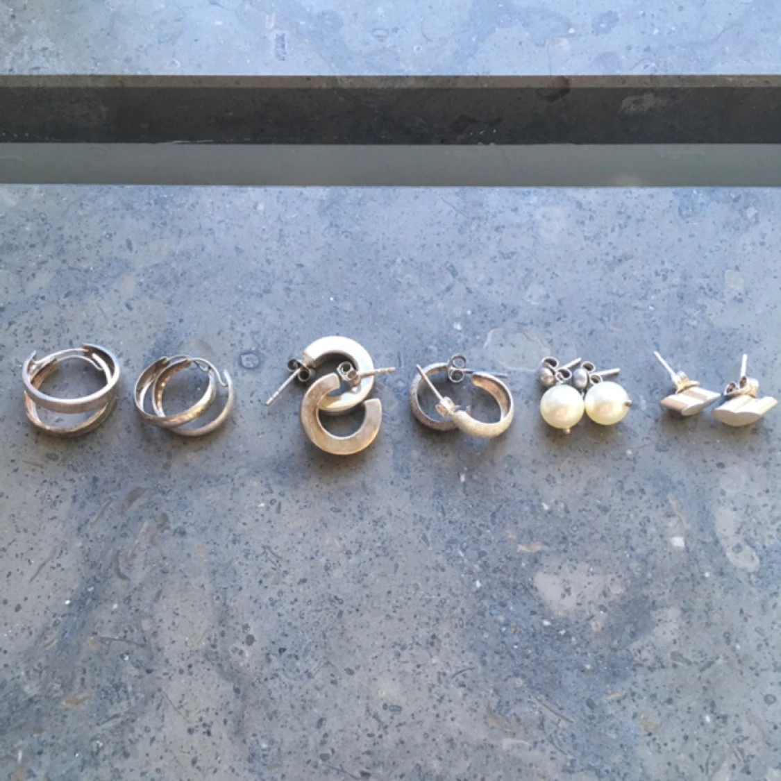 6 par silverörhängen i form av ringar, med vita odlade pärlor eller i form av diagonala hjärtan. Köp alla för 40 kr eller 10 kr/par. Säljs pga nickelallergi, har inte använts på länge nu. Till de hjärtformade örhängena finns det även ett matchande halssmycke som säljs för 10 kr inkl kedja. Frakt 7 kr. Betalning via swish, kontoinbetalning eller via Plick. Kolla gärna in mina andra annonser också. Jag säljer smycken, väskor, sjalar, kläder och skor. Kan samfrakta.