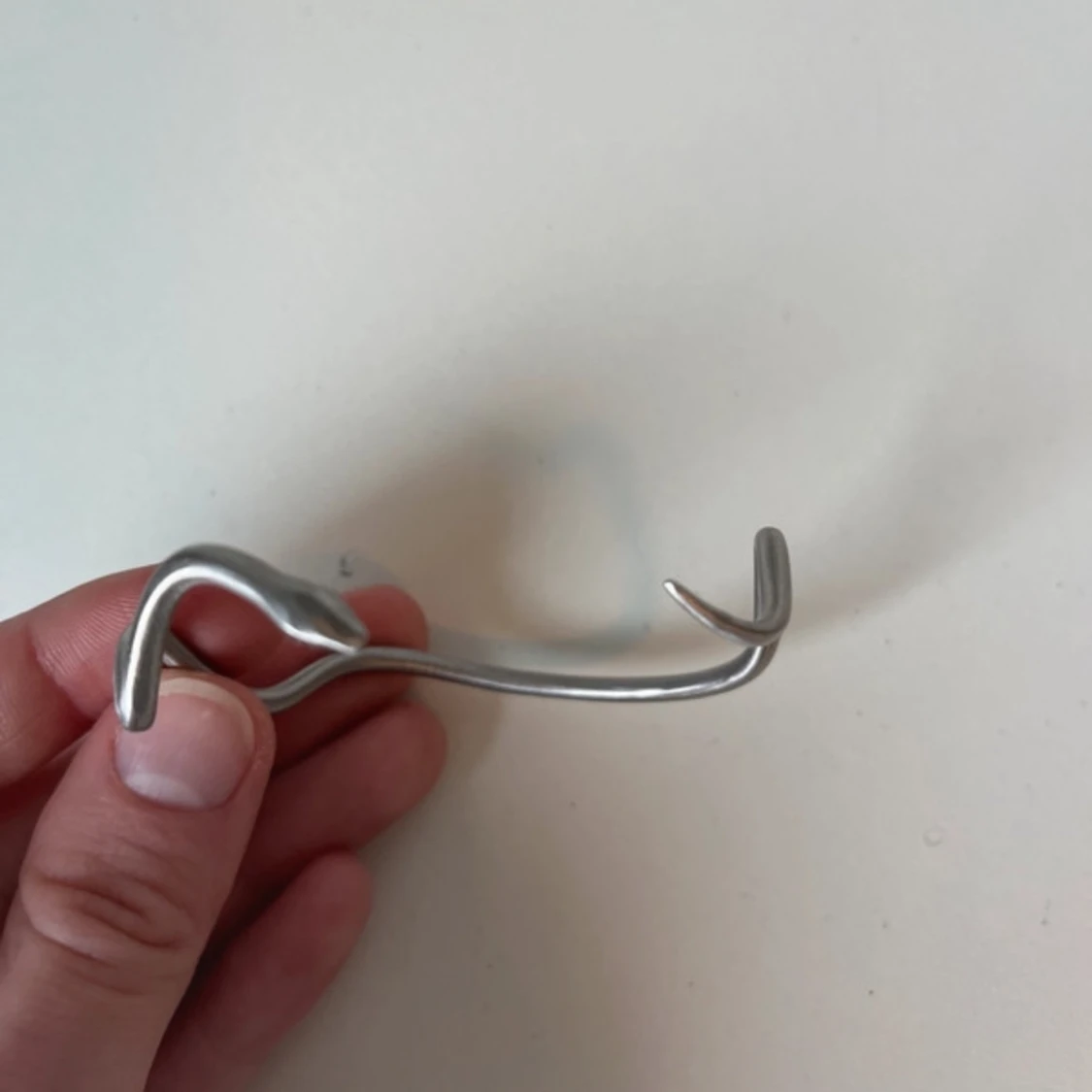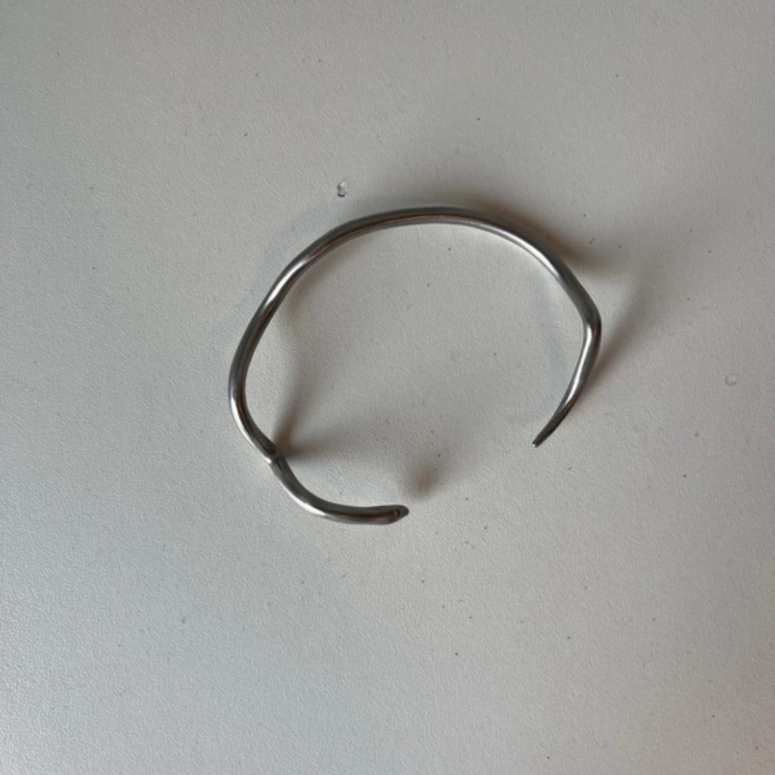Gjord i stål och har inga skador. Det är en mindre storlek men man kan töja in och ut på armbandet.