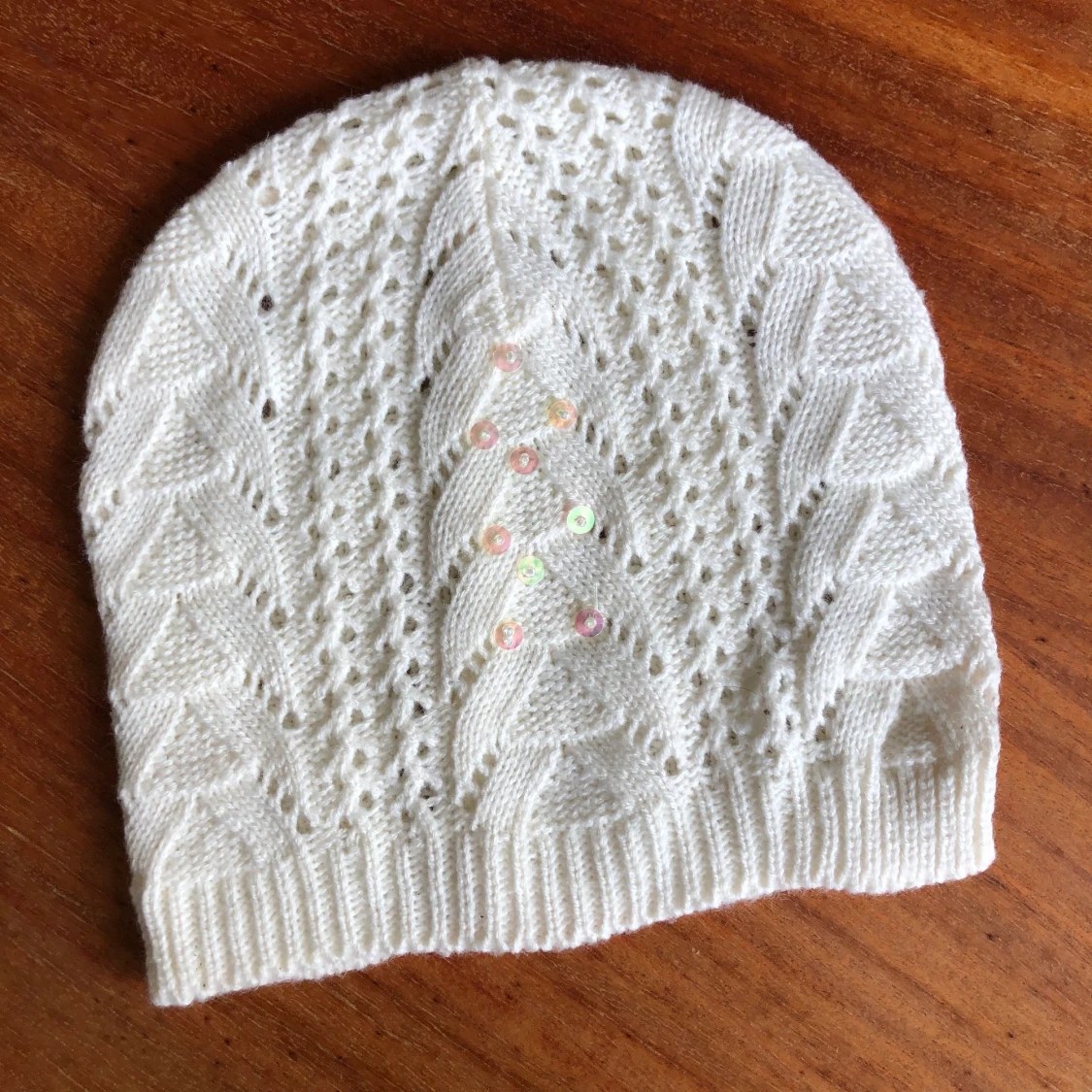 Stickad vit mössa med paljetter. Oanvänd. Kan hämtas i Malmö, osäker på exakt fraktkostnad.