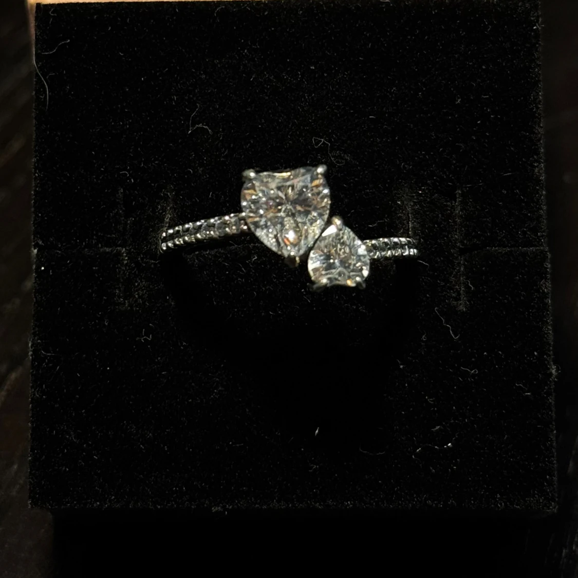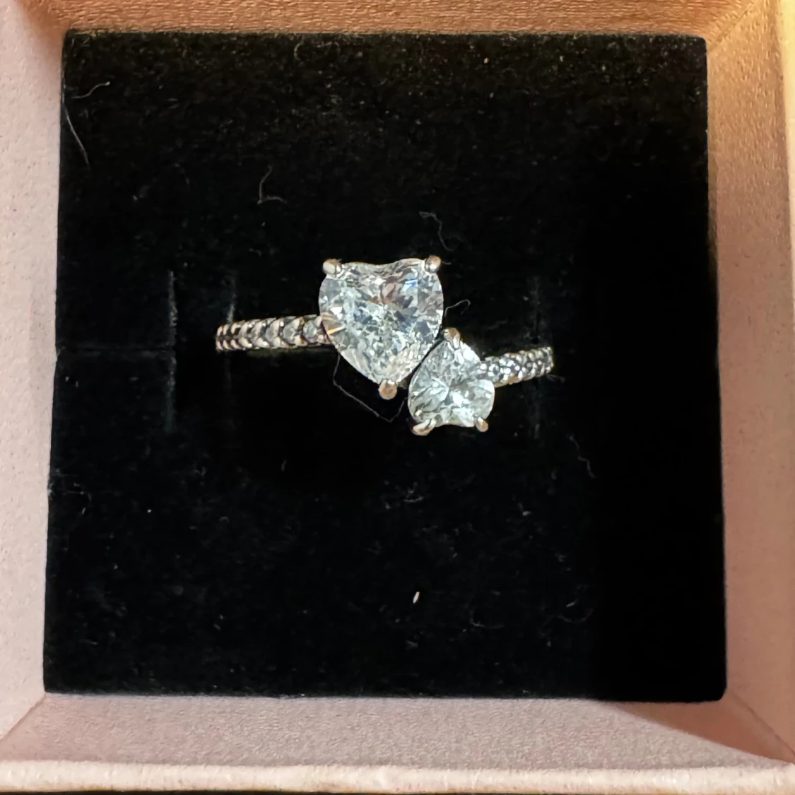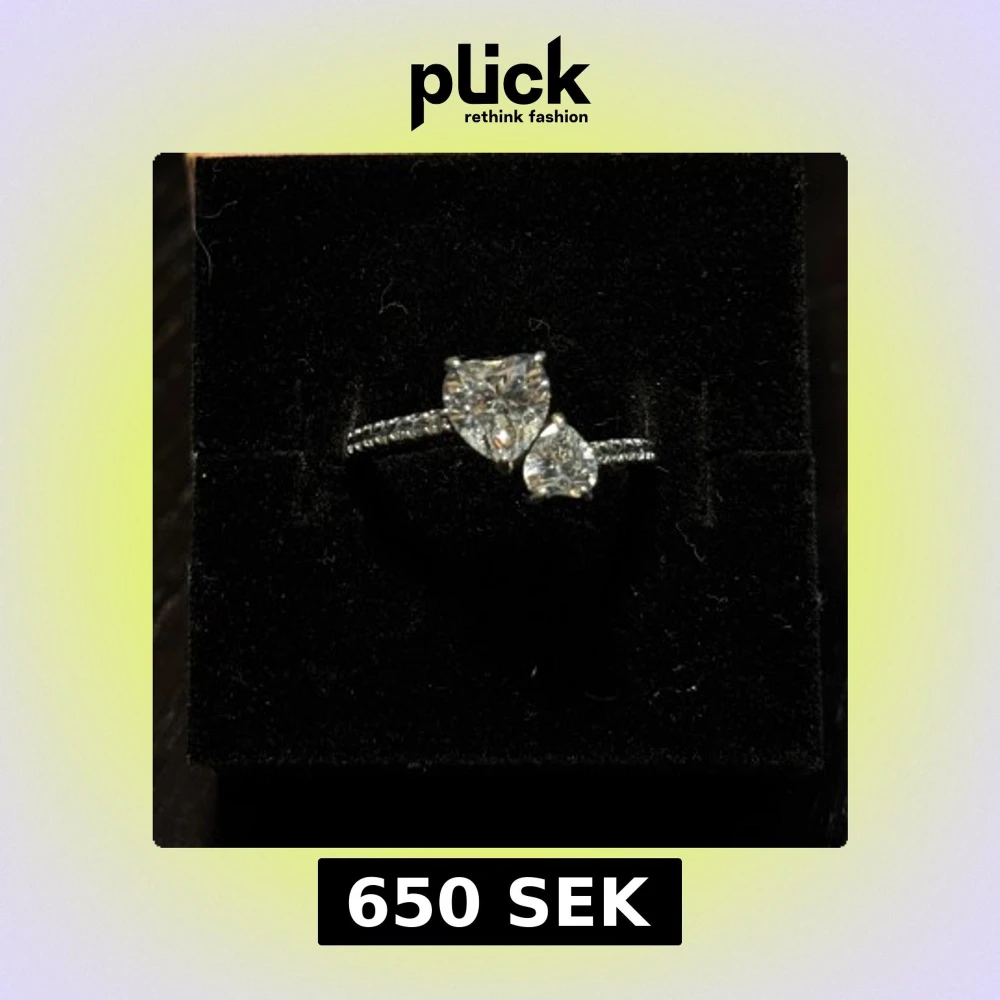 Snygg silverring från Pandora med två hjärtformade stenar och små stenar längs bandet. Kommer i original ask från Pandora. Använd tre gånger.