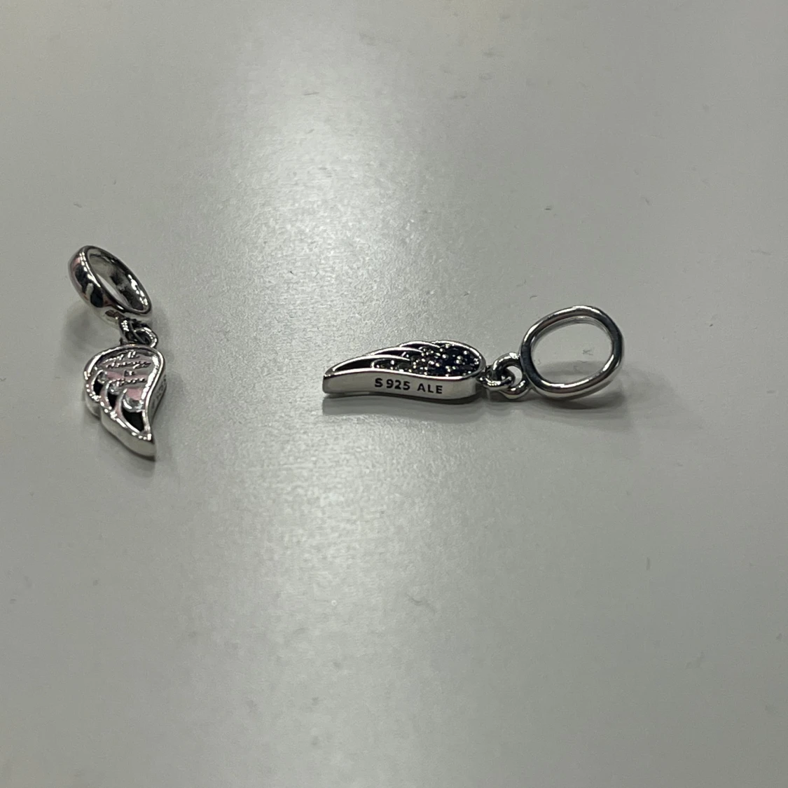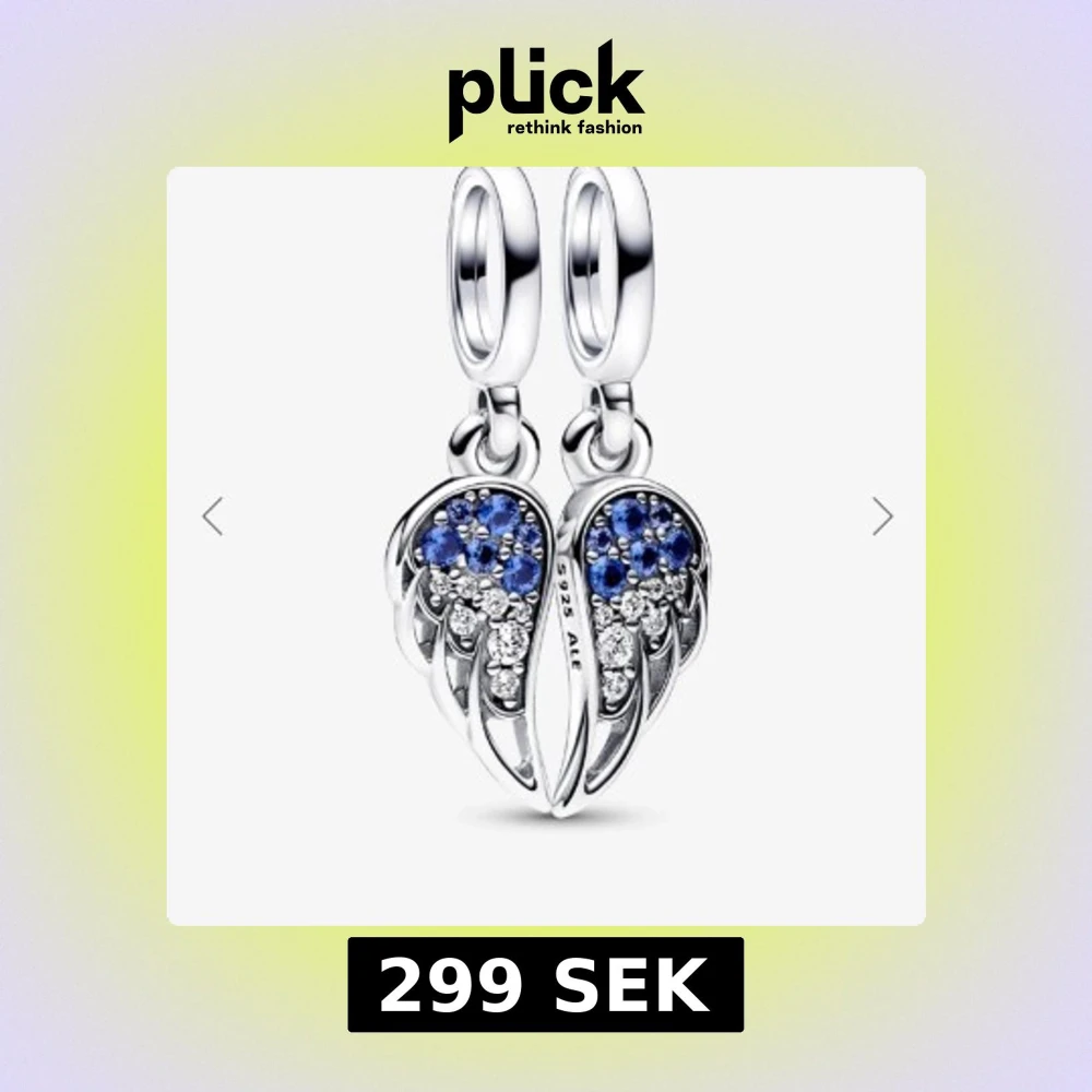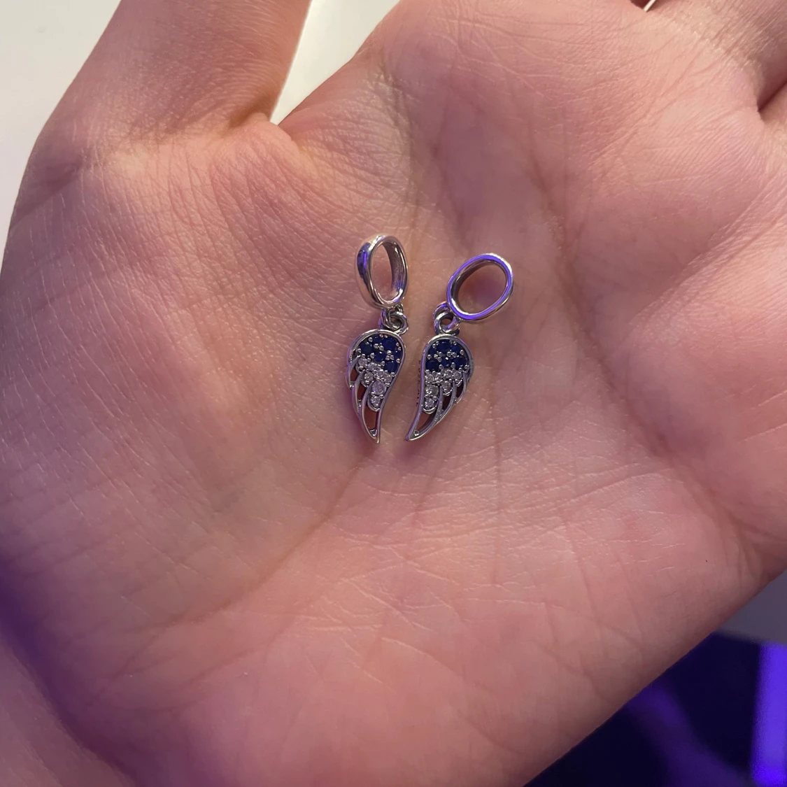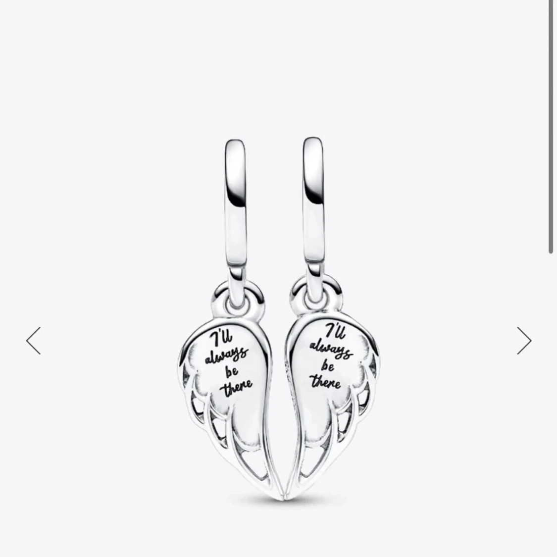 Säljer ett par snygga Pandora örhängen i form av delade hjärtan med vinge-design. Framsidan är dekorerad med blå och klara stenar, baksidan har texten 'I'll always be there'. Gjorda i äkta silver (S925 ALE). Perfekt som vänskapssmycke! Orginal pris 800,- sek