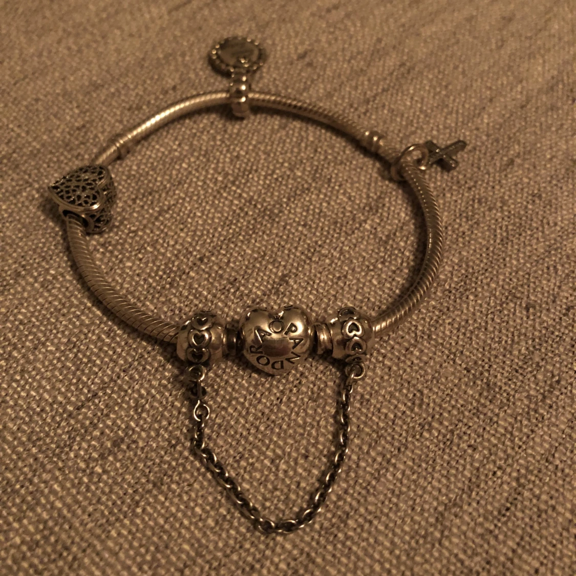 Nypris: - Pandora Moments Heart Clasp. Ormkedjearmband 549kr - Rad av Hjärtan Säkerhetskedja 399kr - Filigran Pärlat Hjärta Berlock 299kr - Sweet sister, clear cz charm 499kr - Sparkling Cross Dangle Charm 469kr totalt: 2215kr Köpare betalar frakt