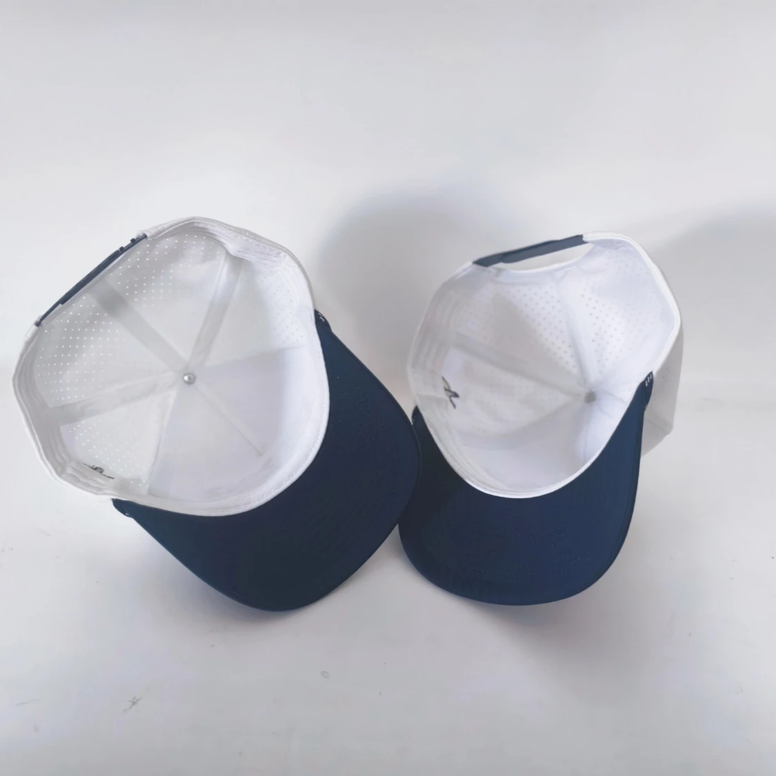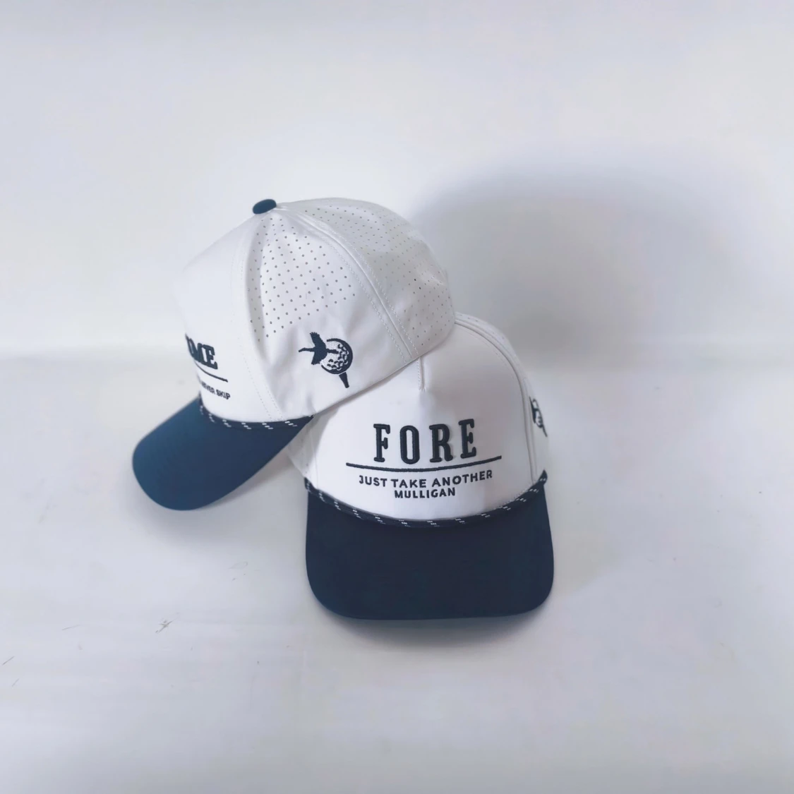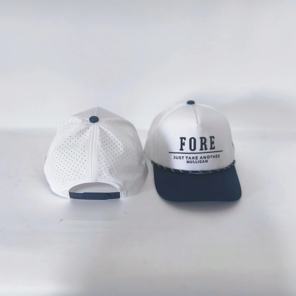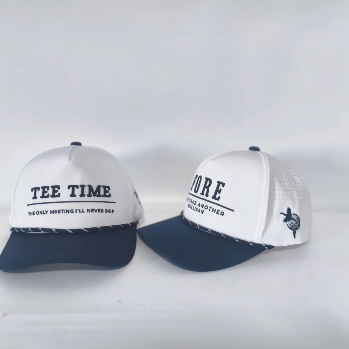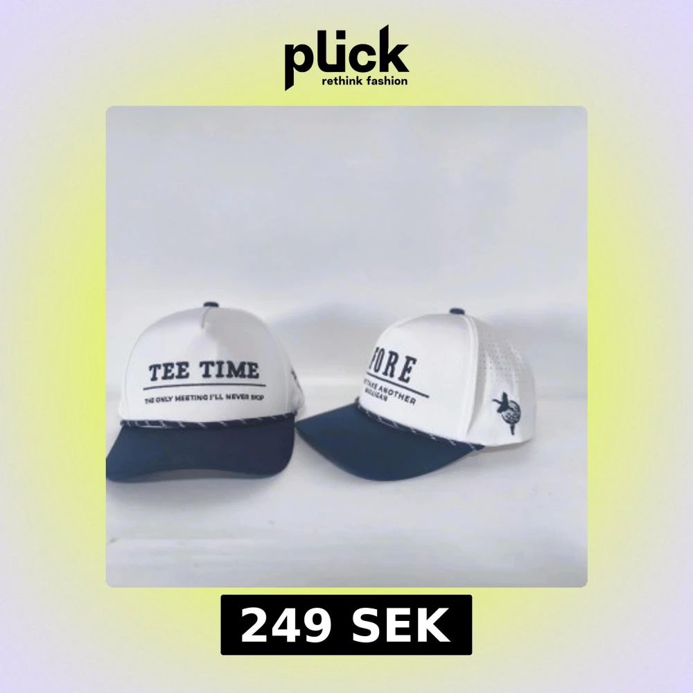 Säljer två snygga kepsar i vitt och marinblått med texten 'TEE TIME' och 'FORE' framtill. Kepsarna har perforerade sidor för extra ventilation och justerbar rem baktill. Perfekt accessoar för golf eller vardag.