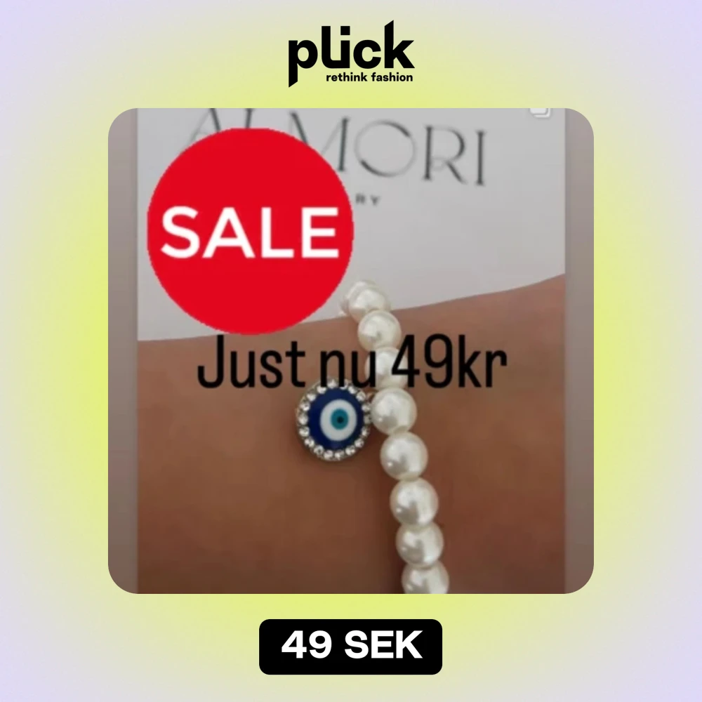 Ett elegant pärlarmband med vita pärlor och ett blått öga som hänge. Hänget är dekorerat med små glittriga stenar runt om.