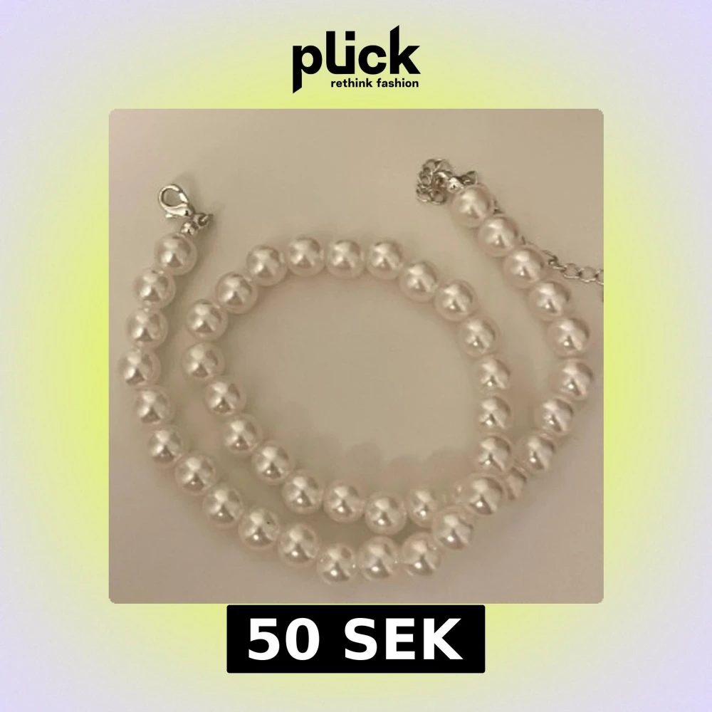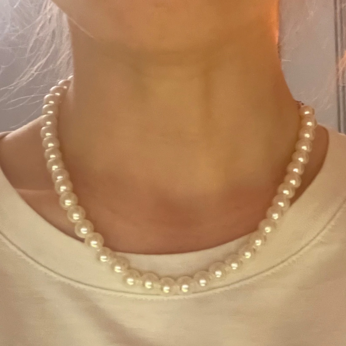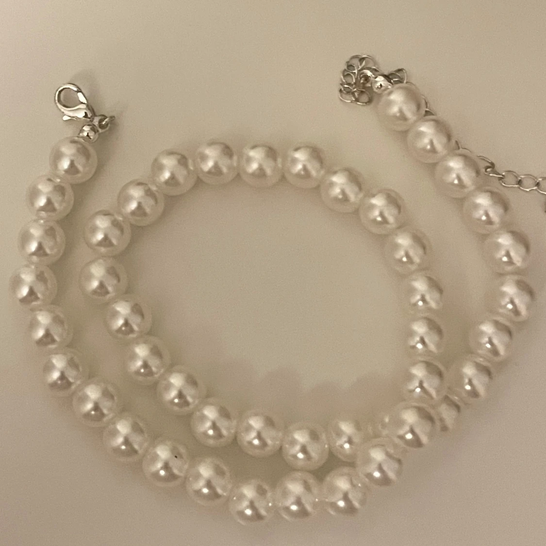 Säljer ett elegant halsband med vita pärlor och silverfärgat spänne. Perfekt för att ge en tidlös och stilren touch till din outfit. Halsbandet har rundade pärlor i jämn storlek och sitter snyggt runt halsen.