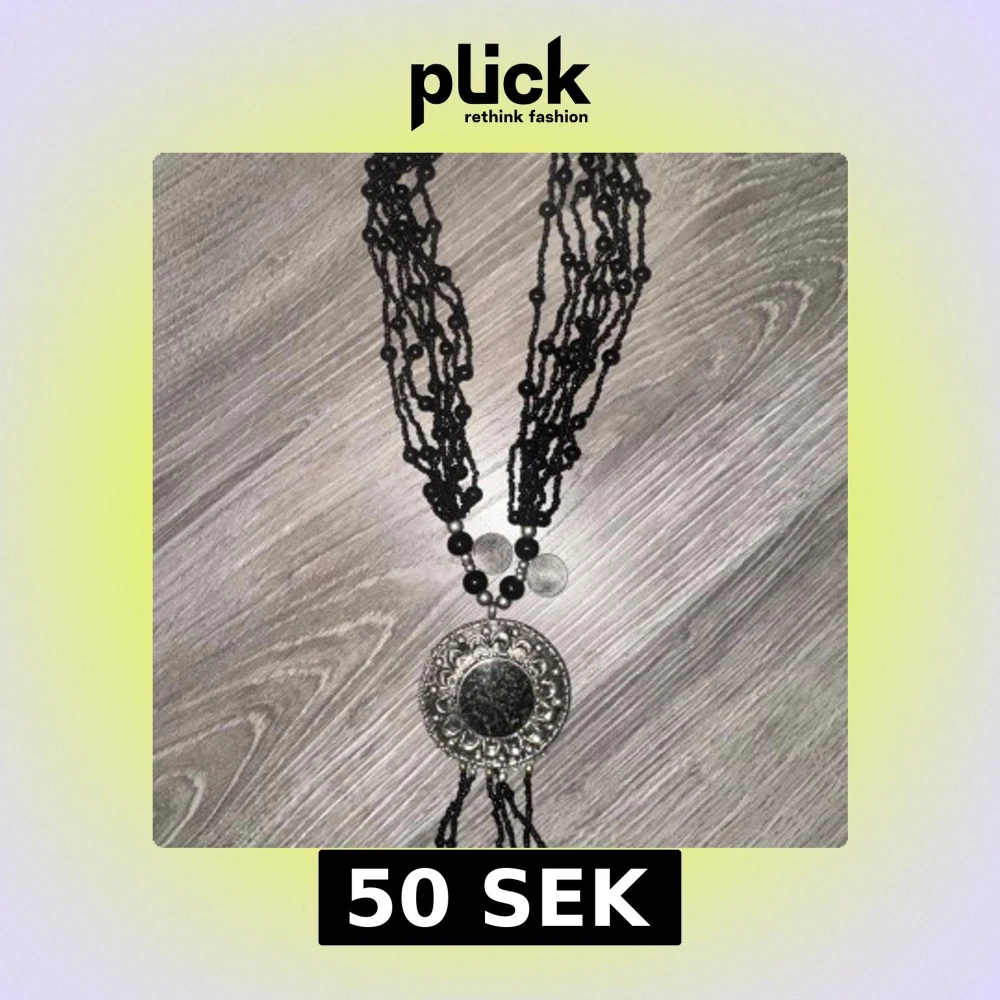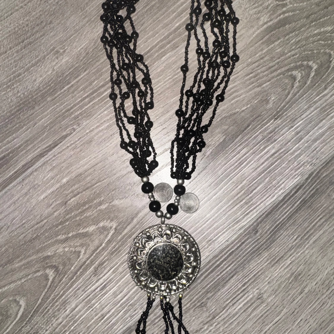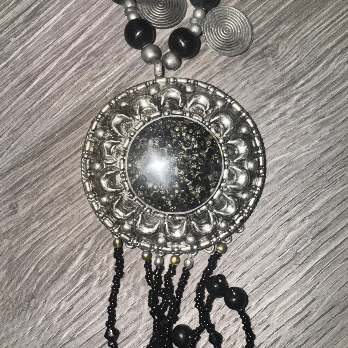 Unikt halsband med flera svarta pärlsträngar och en stor rund medaljong i silverfärgad metall. Medaljongen har en svart glittrig mitt och detaljer runt kanten.
