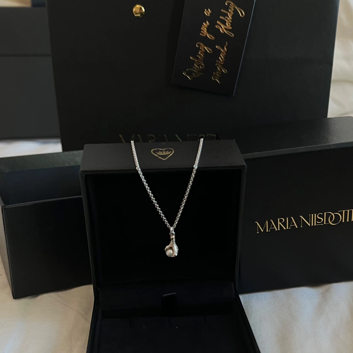 TINY CLAW NECKLACE från Maria Nilsdotter i toppen skick. Inga defekter alls nästan som ny💕nypris 2500kr! Har box och påse och allt. Längd 45cm☺️äkta silver och sötvattenspärla