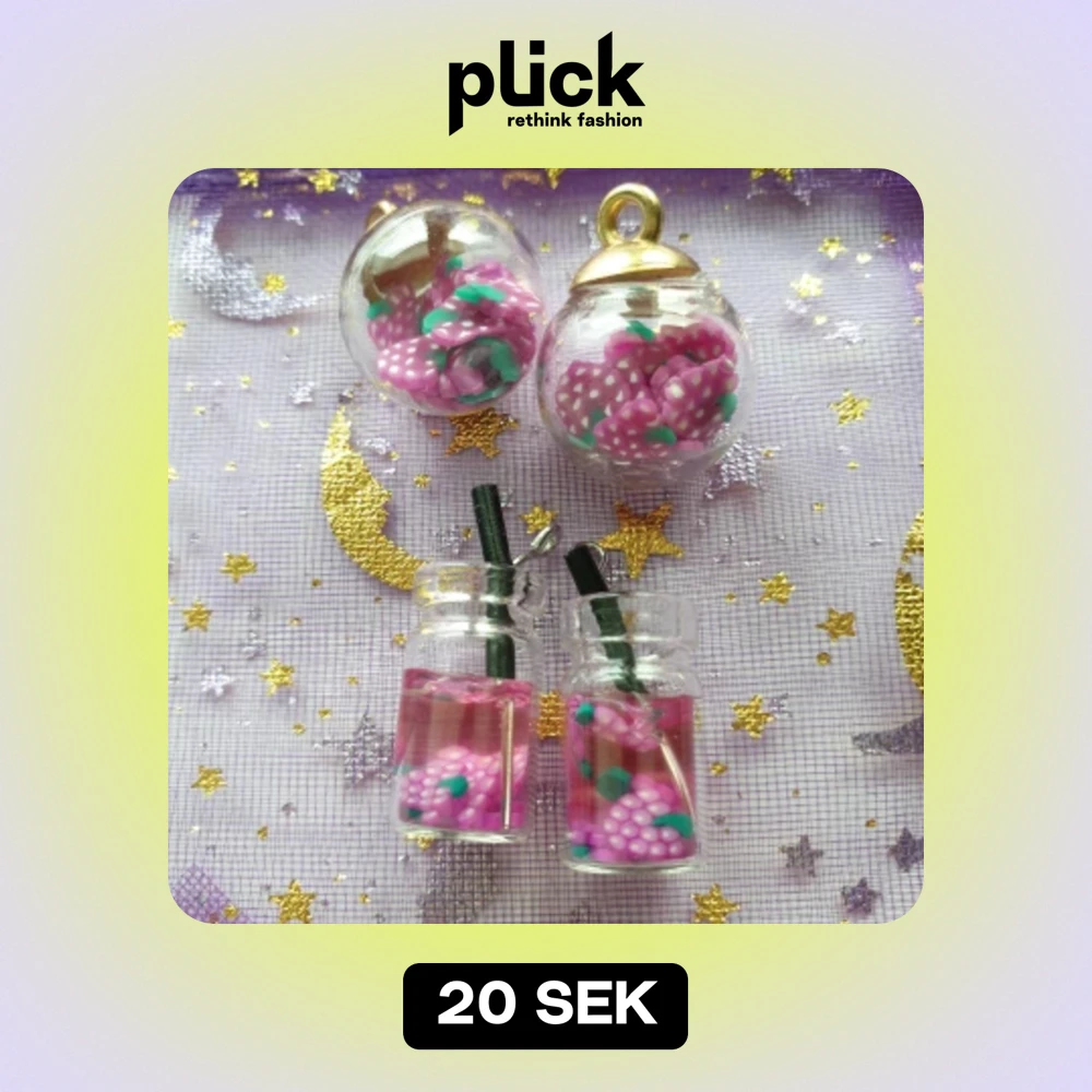 Berlocker, hängsmycke, Motiv: drycker med vindruvor i. Och kulor med vindruvor i. Antal: 4st Skick: oanvända Går att använda till smyckestillverkning, tex sätta på halsband, armband eller göra örhängen av dem.