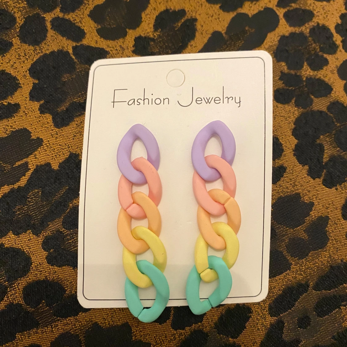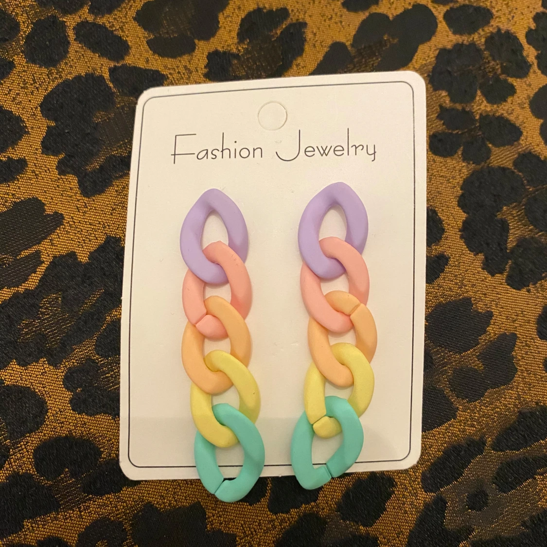 Färgglada chunky örhängen i kedjeform med stora länkar i pastellila, rosa, orange, gul och mintgrön. Statement-accessoar som verkligen poppar och ger en lekfull vibe till din look. Perfekta för dig som älskar färg och unika smycken.
