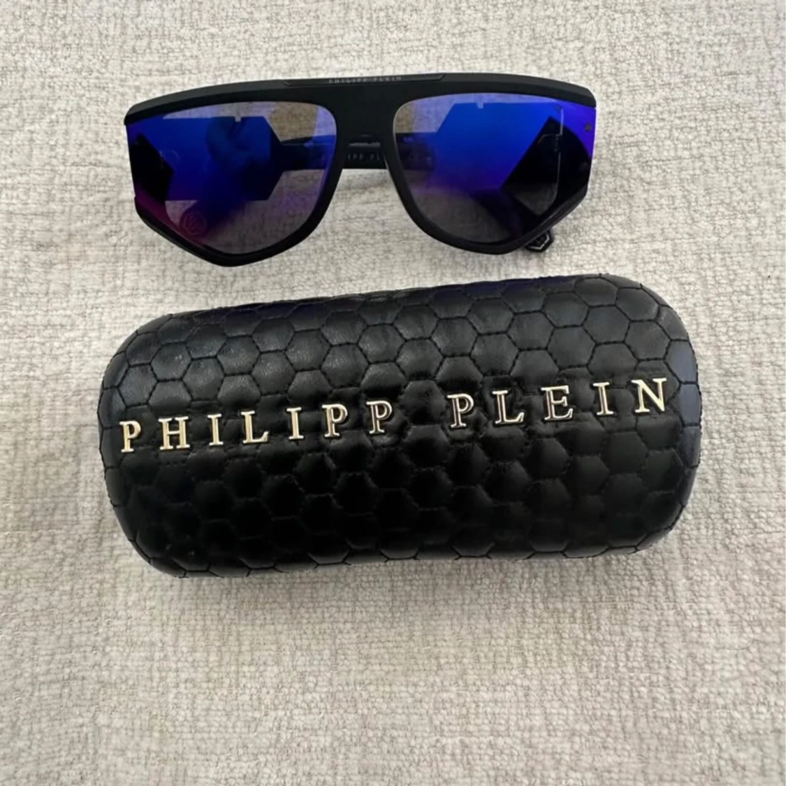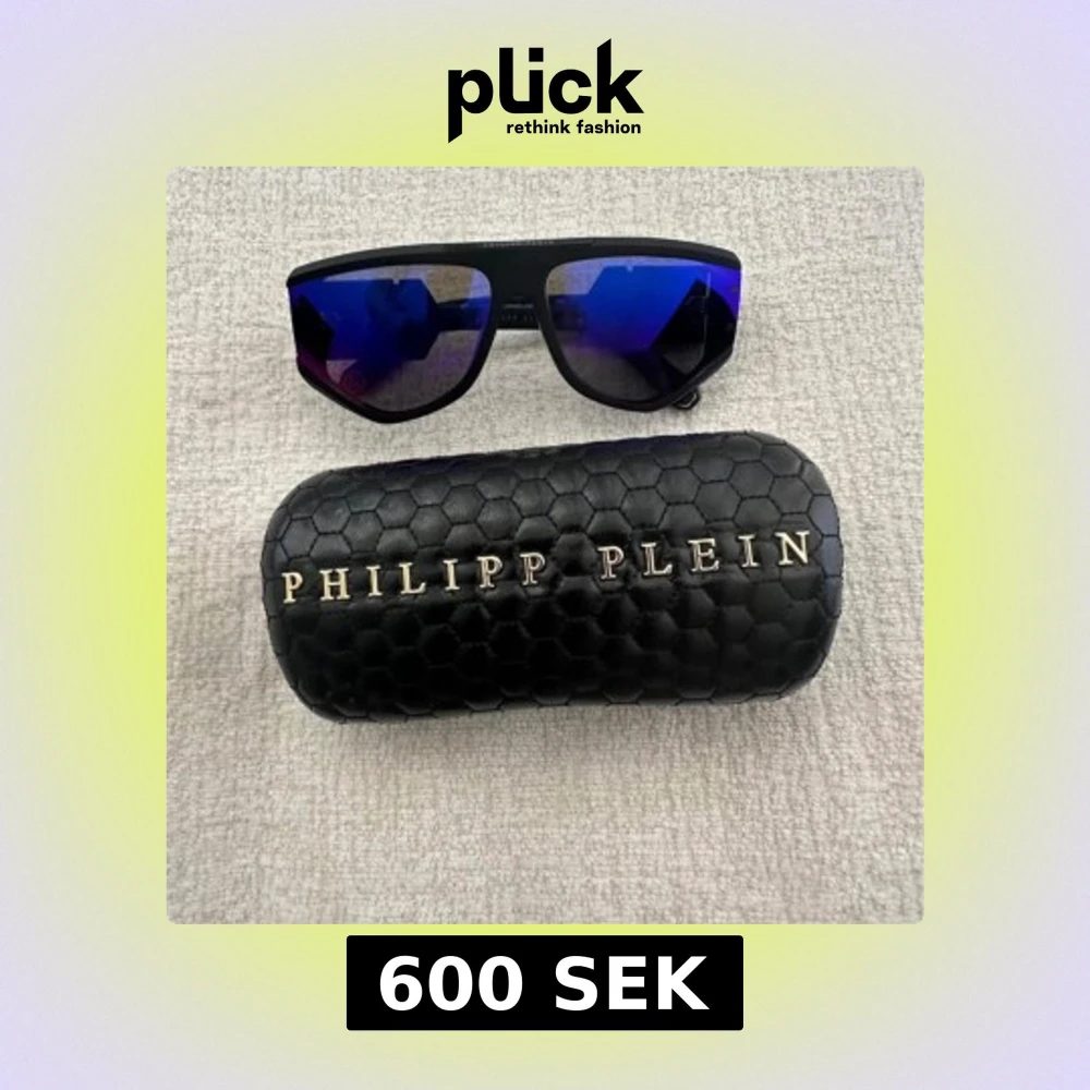 Snygga svarta solglasögon från Philipp Plein med spegelblå-lila glas och bred båge. Ikonisk PP-logga på sidan och coolt, sportigt uttryck. Kommer med ett svart fodral i hexagonmönstrat material med guldtext. Perfekta för dig som vill sticka ut.