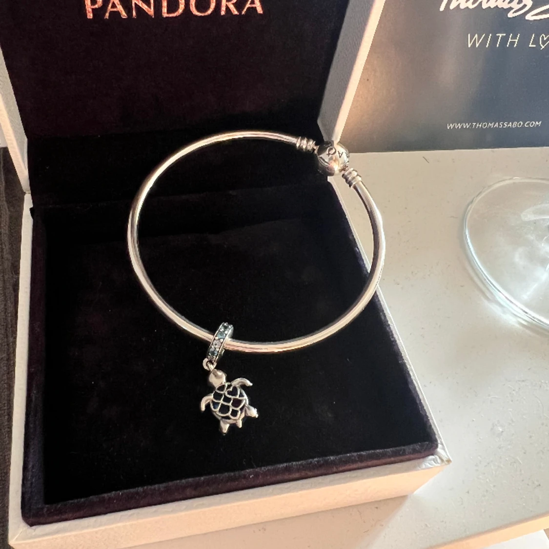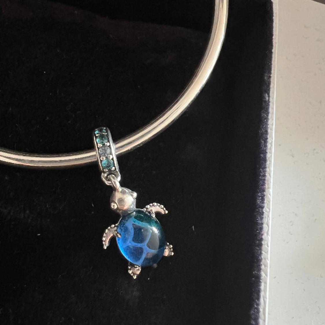 Äkta Pandora berlock (kvitto finns) blå / turkos / grön havssköldpadda i glittrande muranoglas och 925 sterling silver. Berlocken är i nyskick och Nypris är 649.