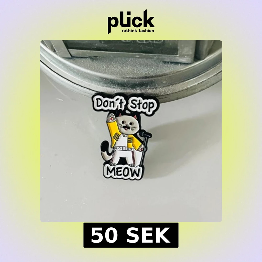 Rolig pin med en tecknad katt utklädd som Freddie Mercury i gul jacka och vita byxor. 🌟