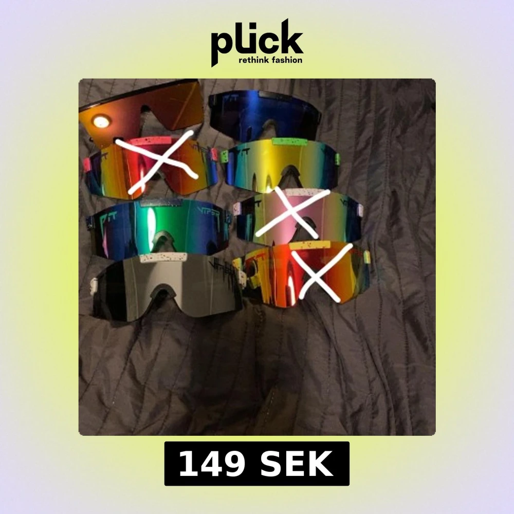 Säljer flera par sportiga solglasögon med spegelglas i olika färger. Perfekta för utomhusaktiviteter och träning. De har en modern och futuristisk design med breda glas och smala skalmar.