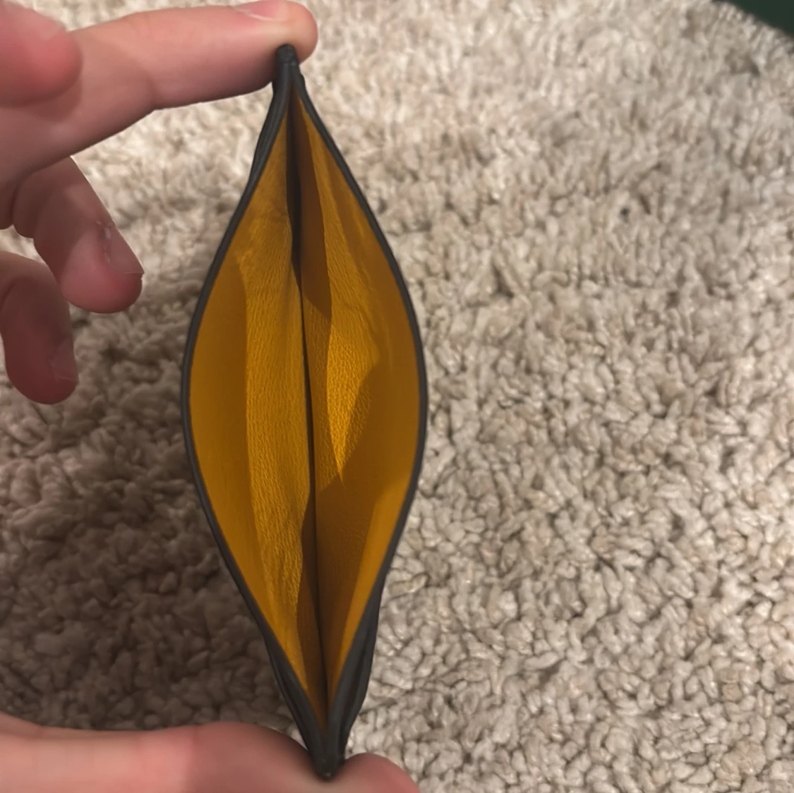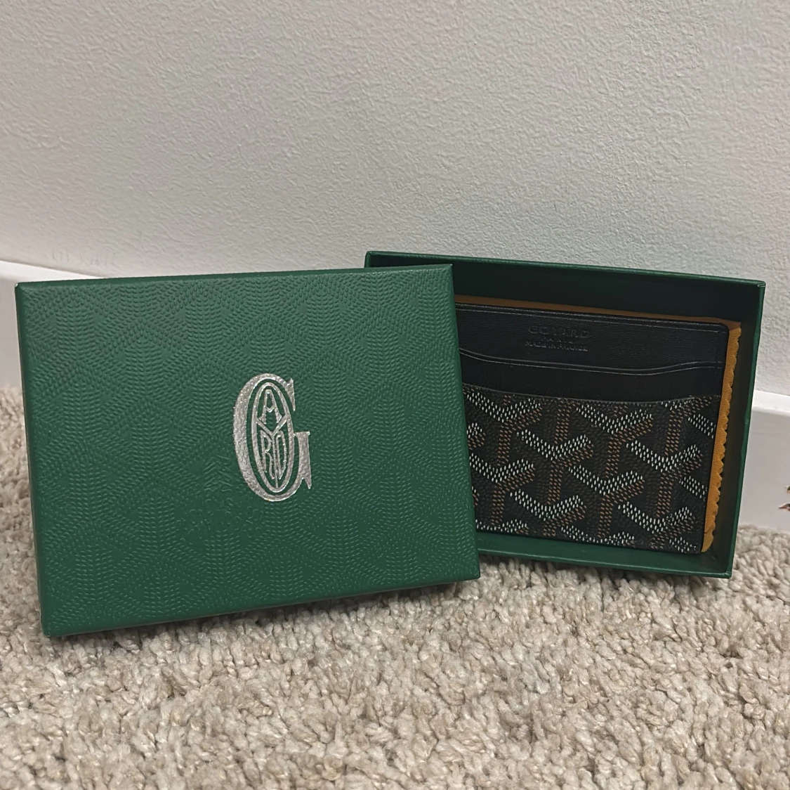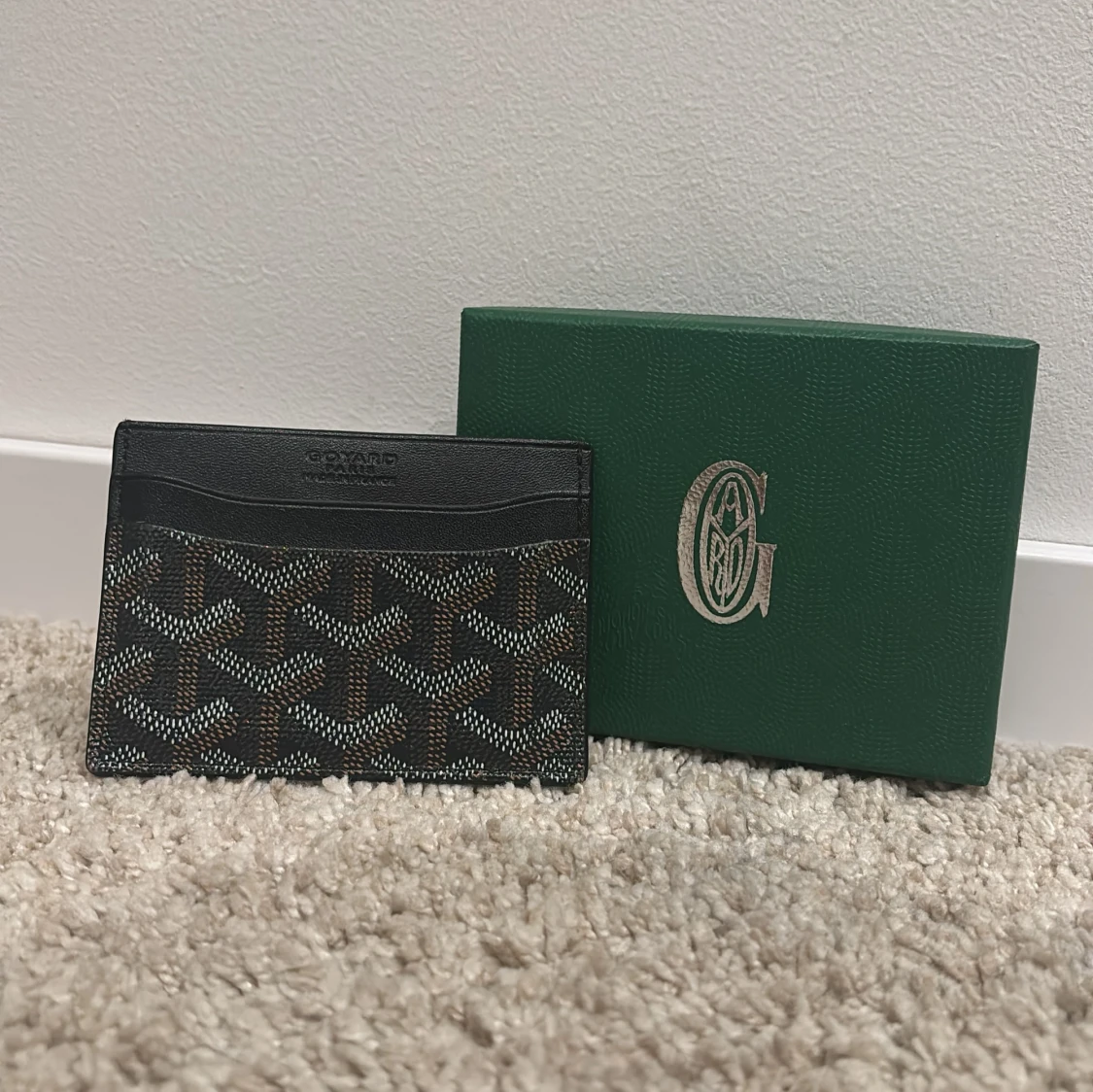 Slimmad korthållare i svart skinn med klassiskt grafiskt mönster i vitt och brunt. Insidan är fodrad i gul skinn och plånboken har flera fack för kort. Kommer med original grön ask med silverlogga.