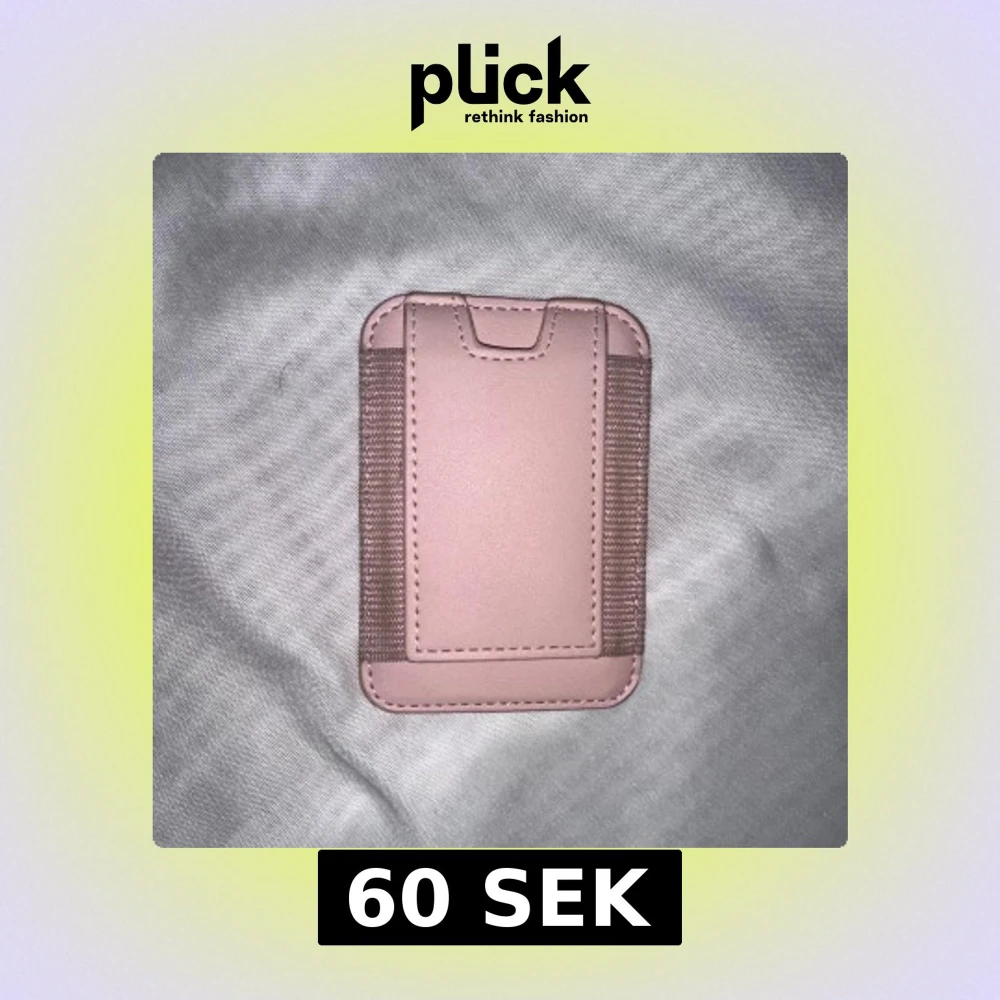 Säljer en stilren rosa magnetisj korthållare med elastiska band på sidorna. Perfekt för att hålla kort och kontanter säkert. Den har en slät yta och en minimalistisk design som passar i fickan.