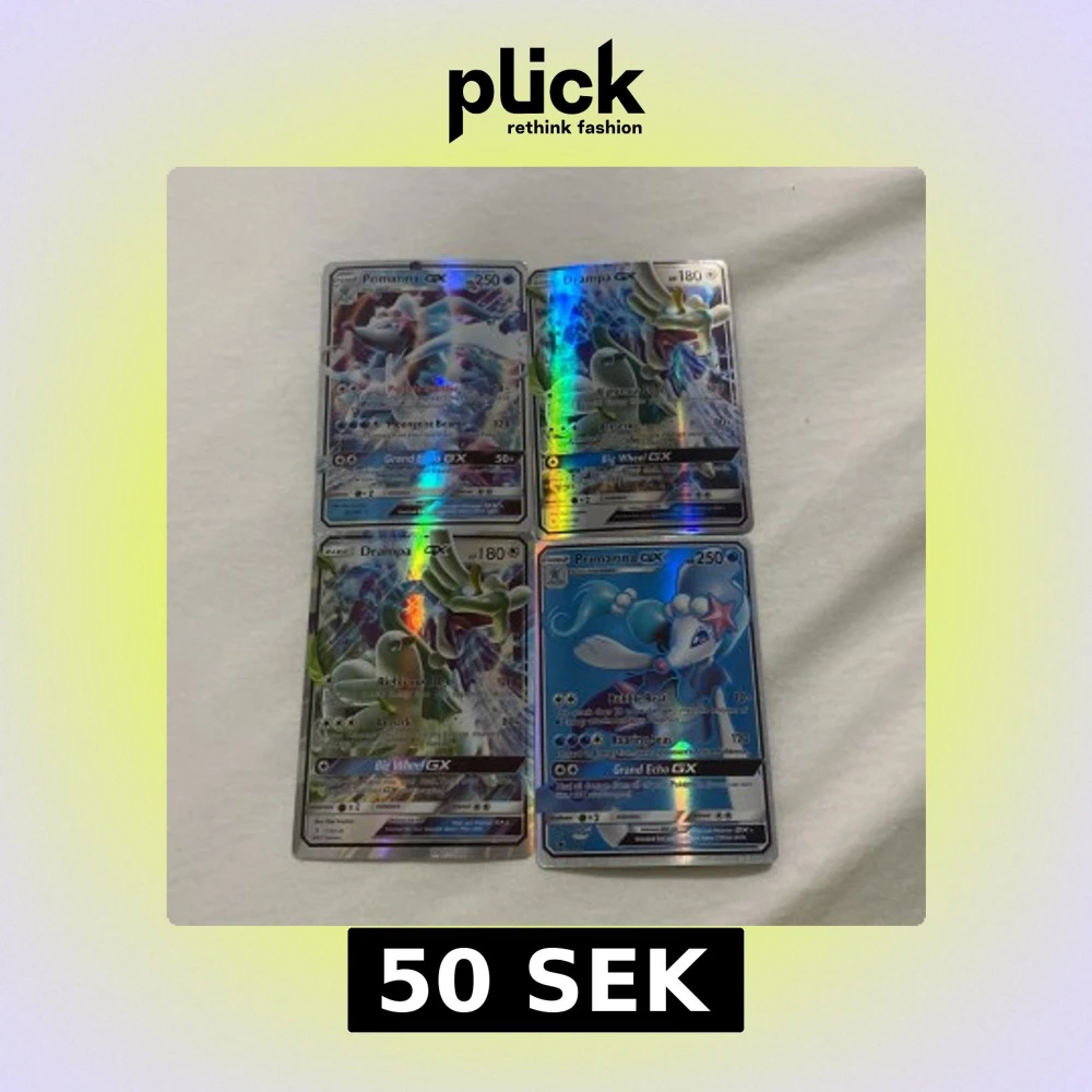 Säljer fyra Pokémon GX-kort, inklusive Primarina GX och Drampa GX. Kortens framsidor har en holografisk yta som ger en glittrande effekt. Primarina GX har 250 HP och Drampa GX har 180 HP. Perfekt för samlare eller Pokémon TCG-spelare!