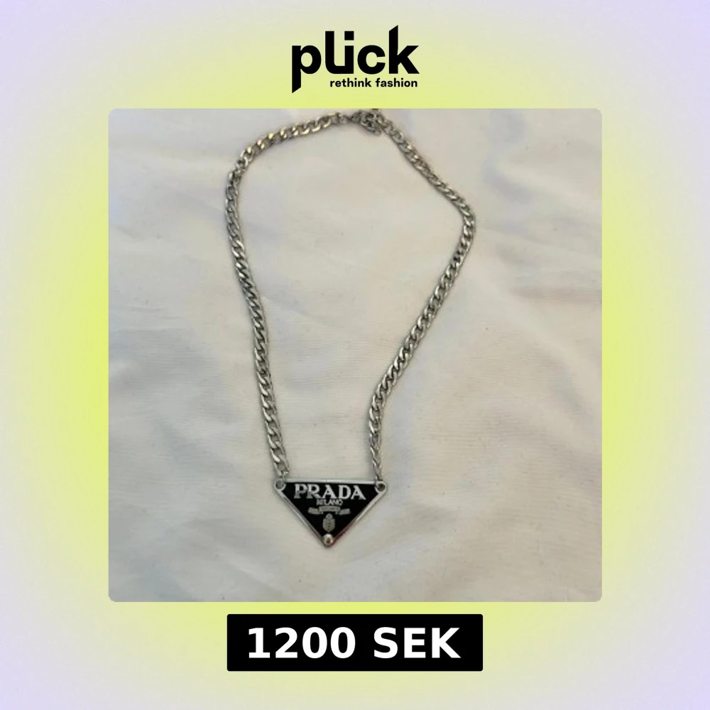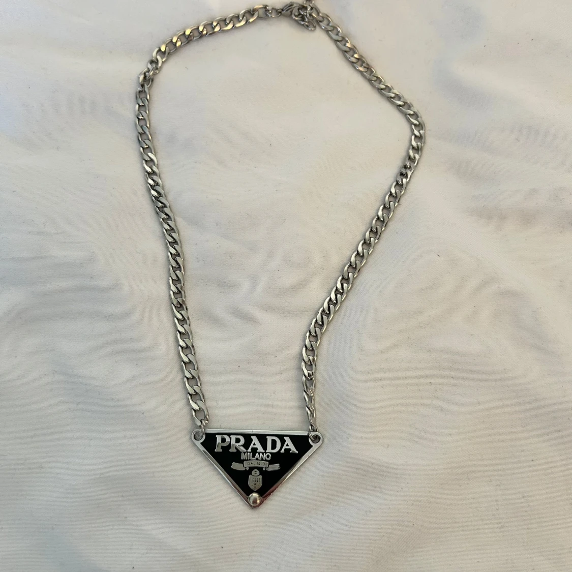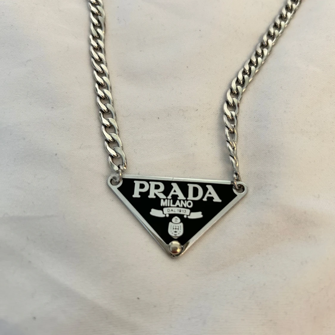 Säljer ett snyggt halsband från Prada i silverfärg med en kraftig kedja och en ikonisk svart triangelplatta med logotypen 'PRADA MILANO'. Perfekt statement-piece för att lyfta din outfit.