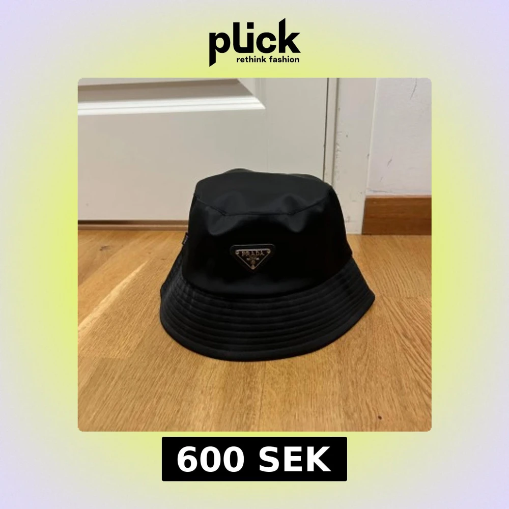 Stilren svart bucket hat från Prada med klassisk siluett och ikonisk metallogo framtill. Hatten är tillverkad i glansig syntet och har bred, nedåtlutande brätte. Perfekt accessoar för att lyfta din outfit med en lyxig touch.