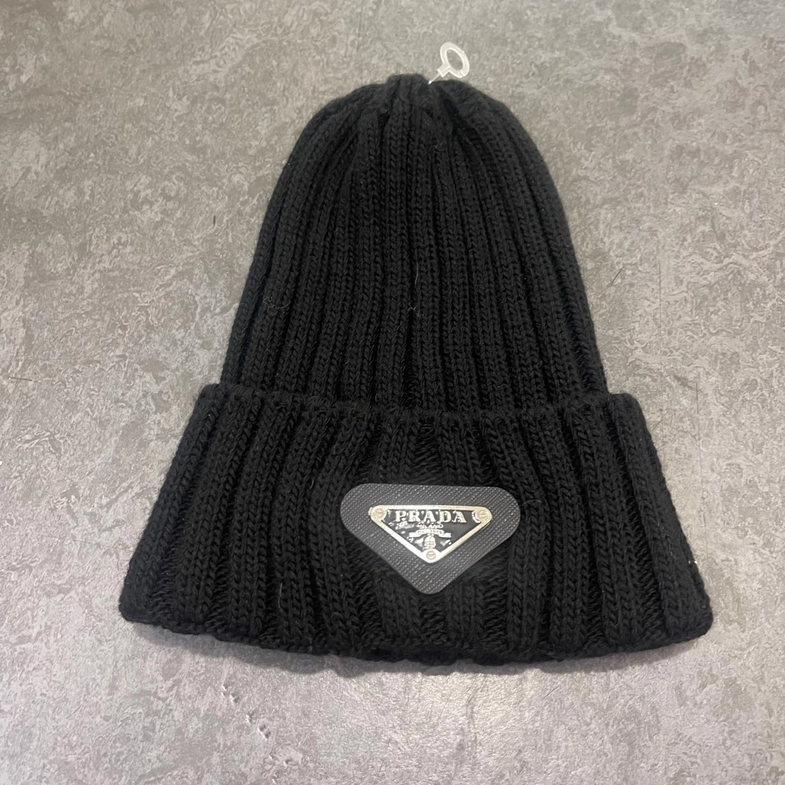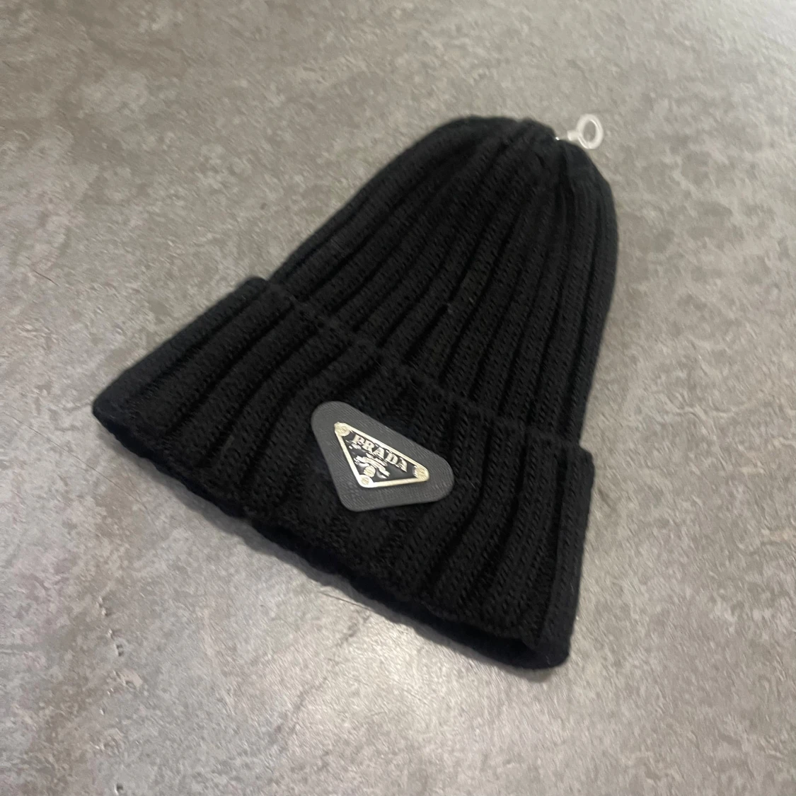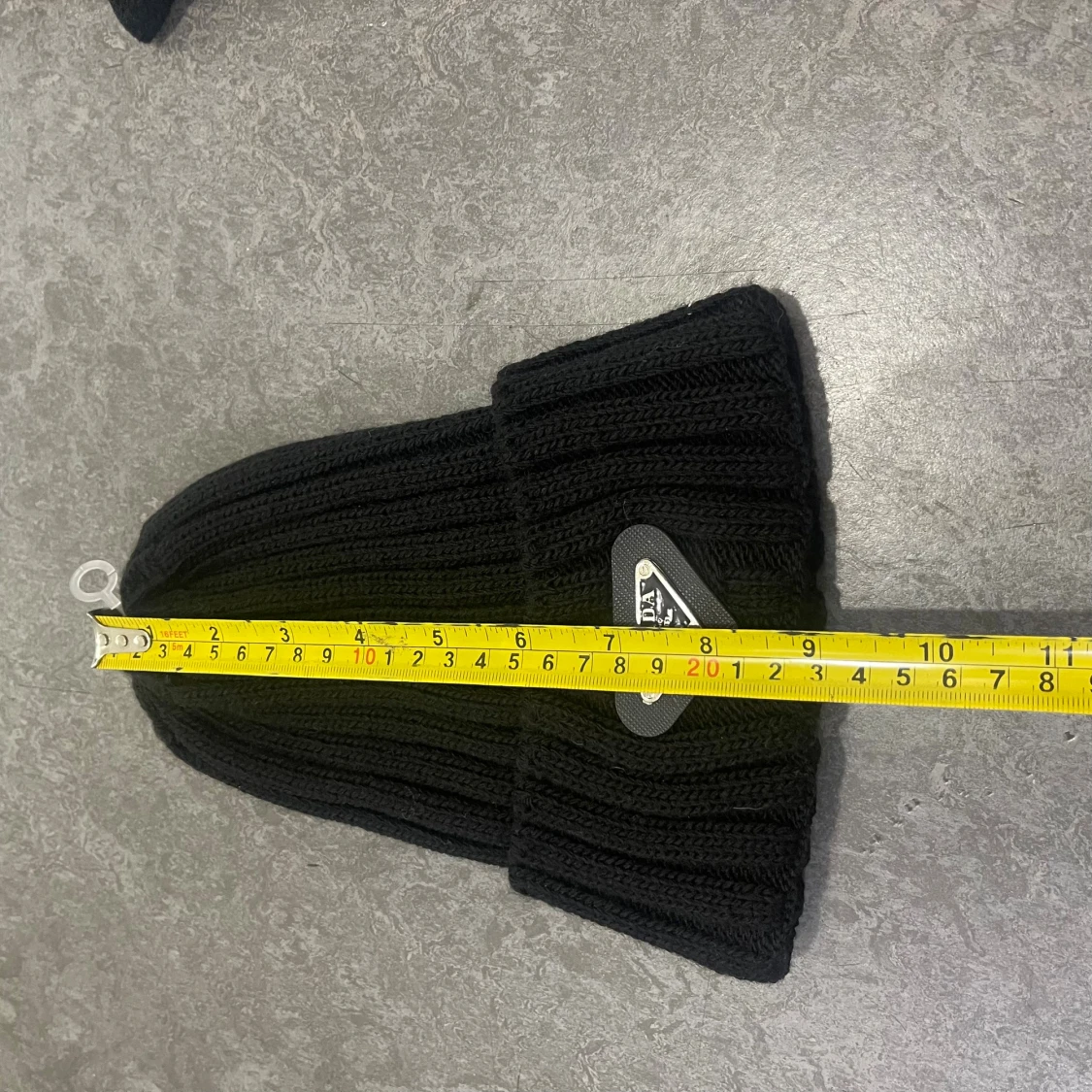 Svart ribbstickad mössa från Prada med klassisk uppvikt kant och ikonisk trekantig logotyp framtill. Mössan är tillverkad i ett mjukt stickat material som håller dig varm och ger en clean, stilren look. Perfekt accessoar för kalla dagar och streetstyle.
