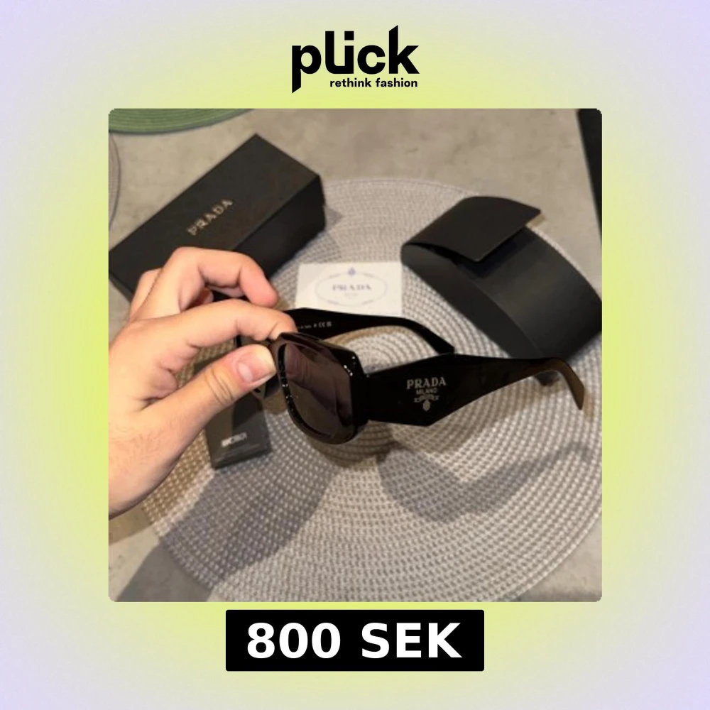 Snygga svarta solglasögon från Prada med breda skalmar och fyrkantig form. Glasögonen har en glansig finish och tydlig Prada-logga på sidan. Kommer med originalfodral, box och äkthetskort – perfekt för dig som vill ha en lyxig och trendig accessoar.