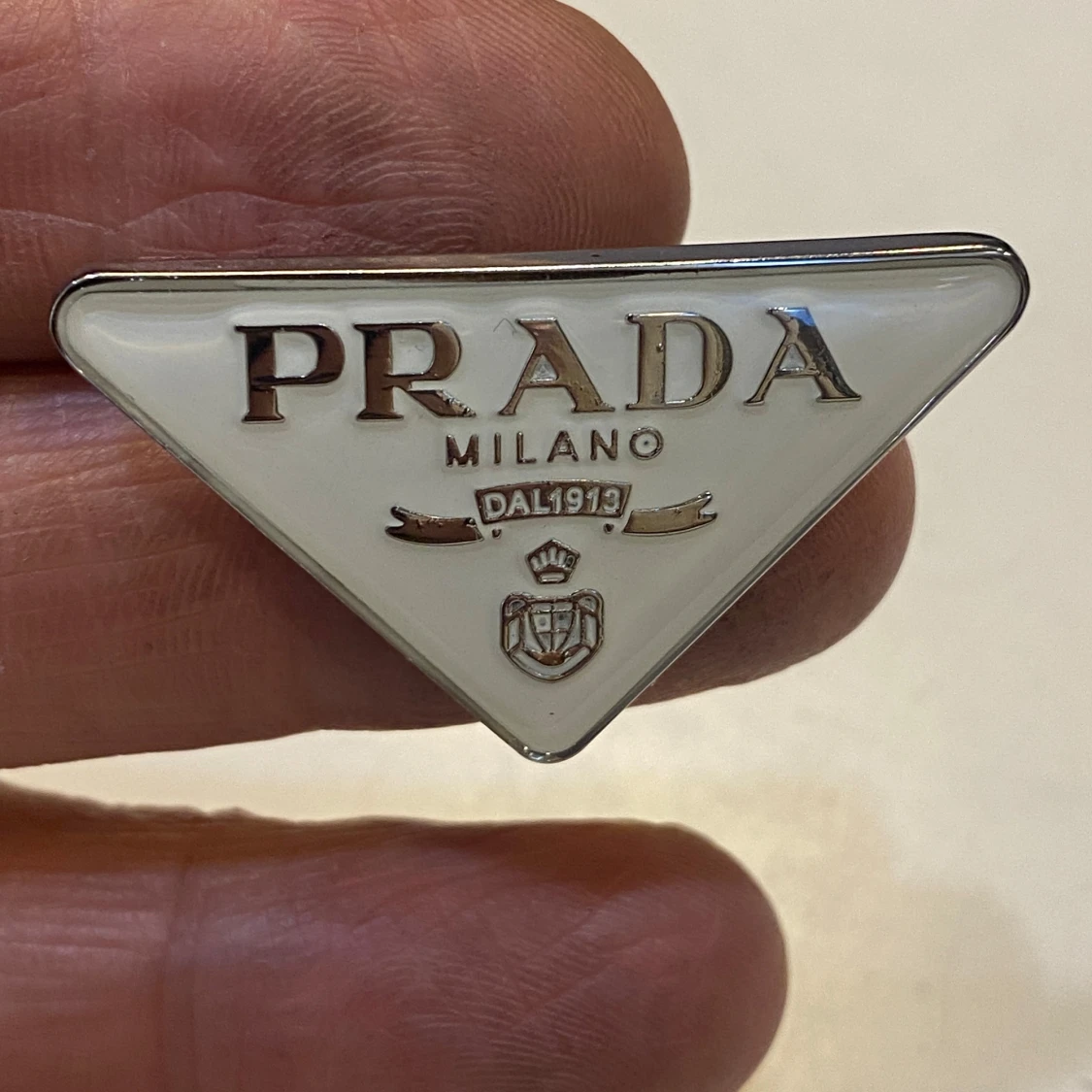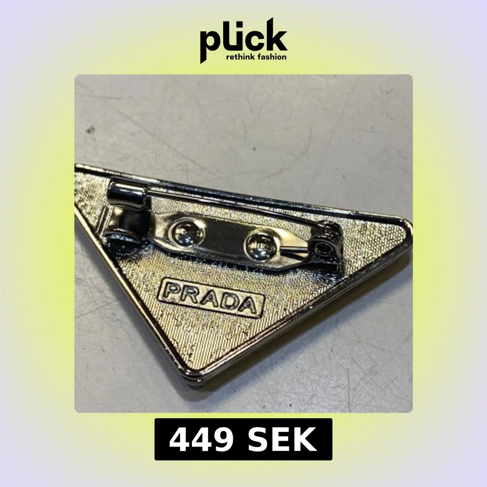 Snygg triangelformad brosch i silverfärgad metall med vit emalj och tydlig logotyp. Broschen har klassisk nål på baksidan och detaljer med texten . Perfekt accessoar för att lyfta din outfit.