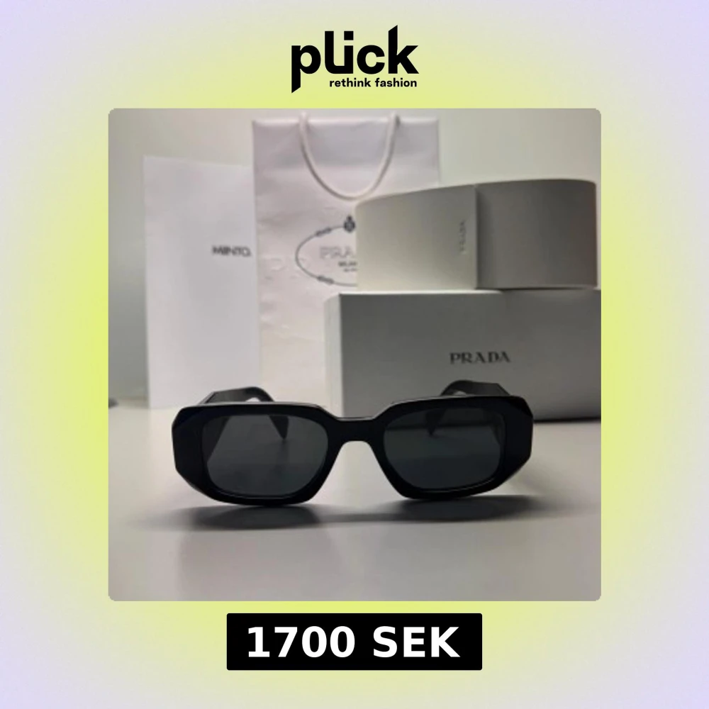 Populära solglasögon från Prada med rektangulära, kantiga bågar och mörka glas. Tjocka skalmar med Prada-logga på sidan. Knappt använda, väldigt bra skick. Allt original förpackning samt kvitto medföljer.