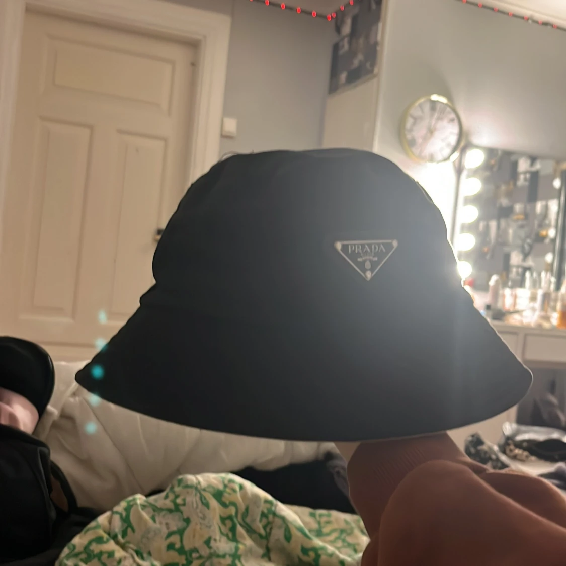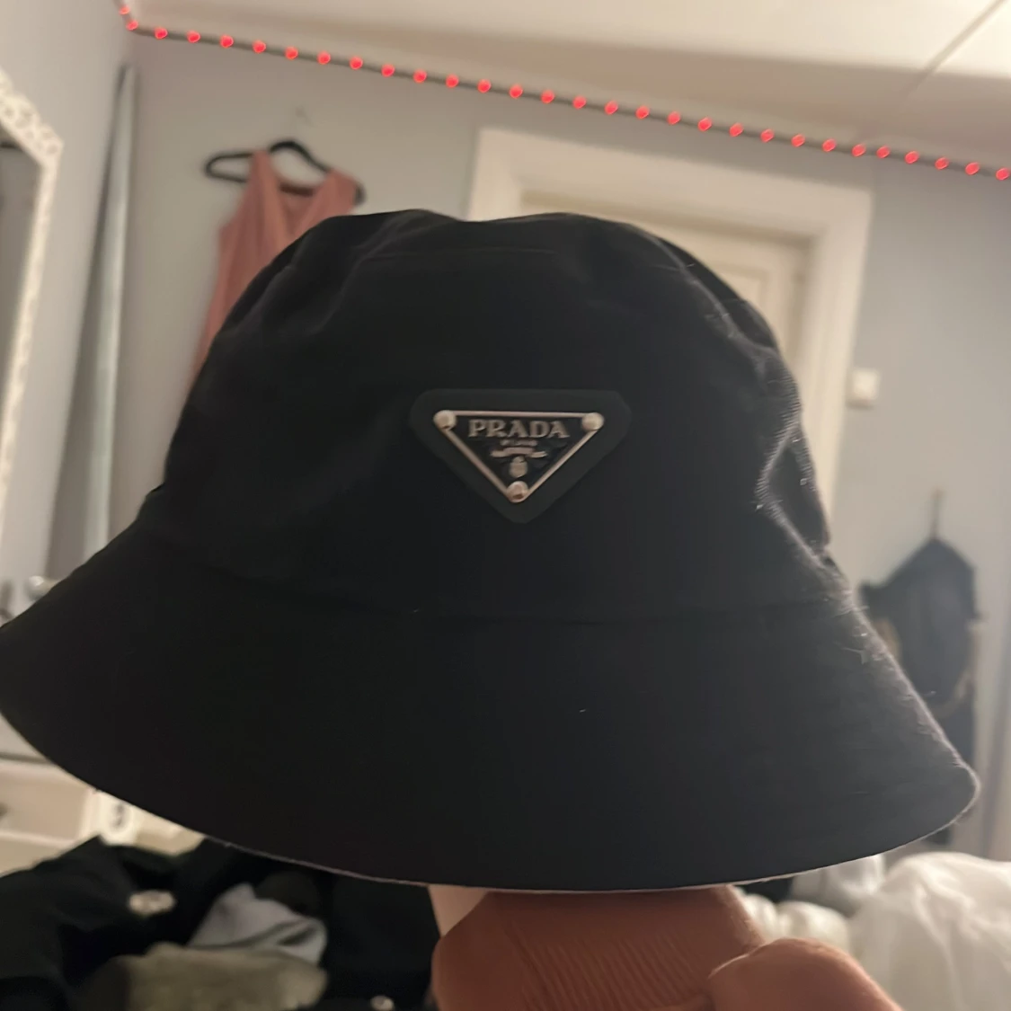 Snygg svart hatt från Prada med en klassisk design. Hatten har en diskret logotyp framtill och är perfekt för en stilren look. Den är bekväm och passar till alla klädstilar, Jag köpte den för 6 292 kronor och nu säljer jag den för 3 000 hälften av priset men skriv privat om du är snabb får du den billigare , och den är som ny🫶🏼