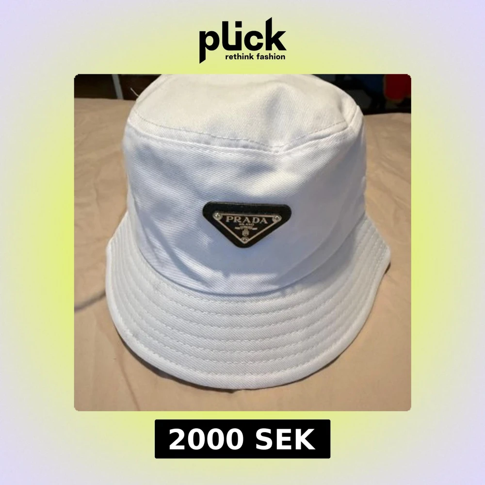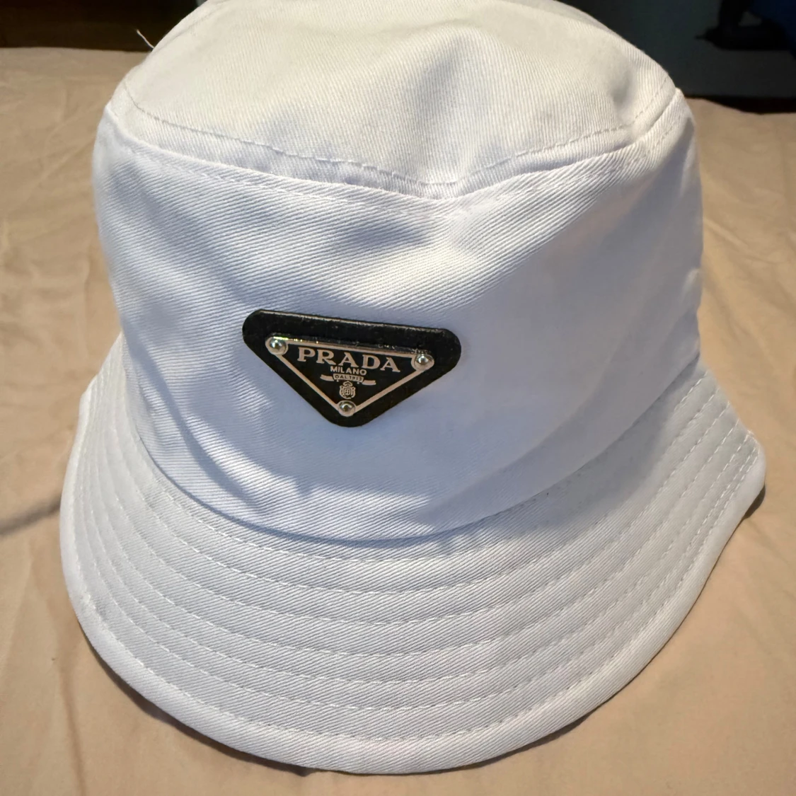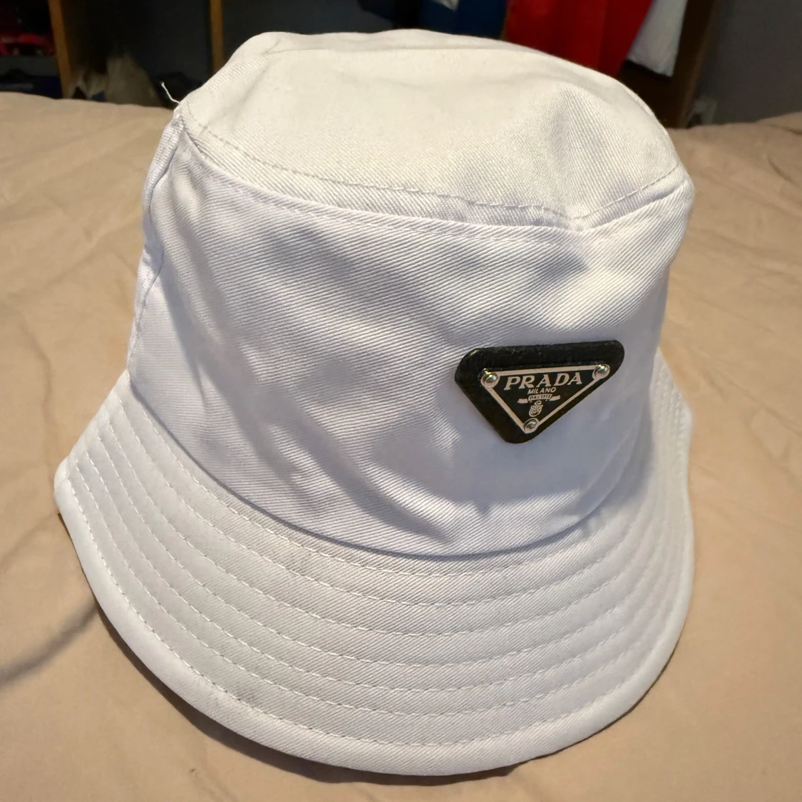 Snygg vit hatt från Prada med en klassisk design. Hatten har en bred kant och ett elegant märke framtill. Perfekt för att ge en stilren touch till din outfit.