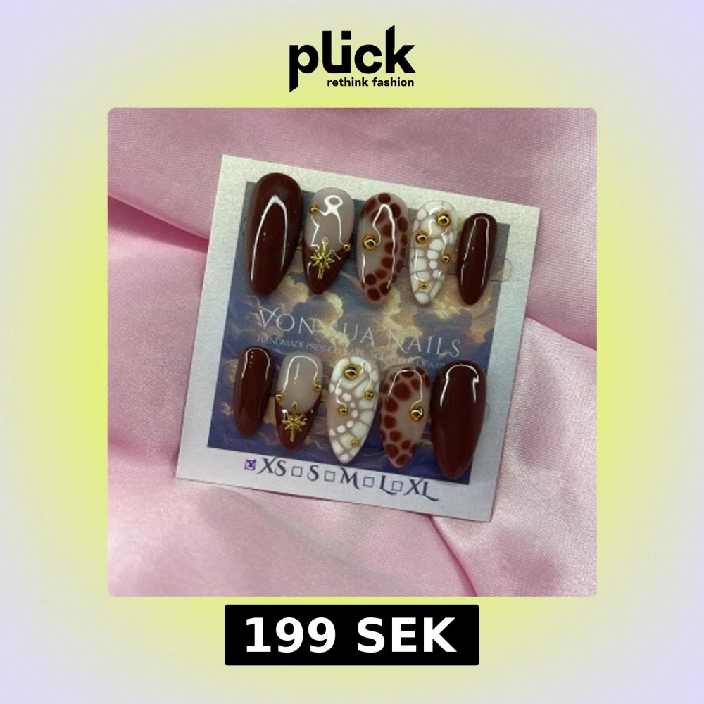 Snygga handgjorda press-on naglar i brunt och beige med coola mönster, vita detaljer och guldiga dekorationer. Mix av handmålademönster, prickar och stjärnor. Kommer i storlek XS: 14 mm, 11 mm, 11,5 mm, 10 mm, 8 mm . Perfekt för dig som vill ha unika naglar utan att gå till salong.