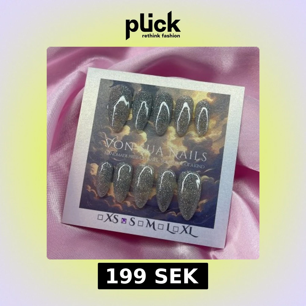 Snygga handgjorda press-on naglar med silvrigt glitter och vita detaljer. Naglarna har en medium almond-form och kommer i S: 15 mm, 11,5 mm, 12 mm, 11 mm, 9 mm . Perfekt för dig som vill ha en glam look med extra edge.