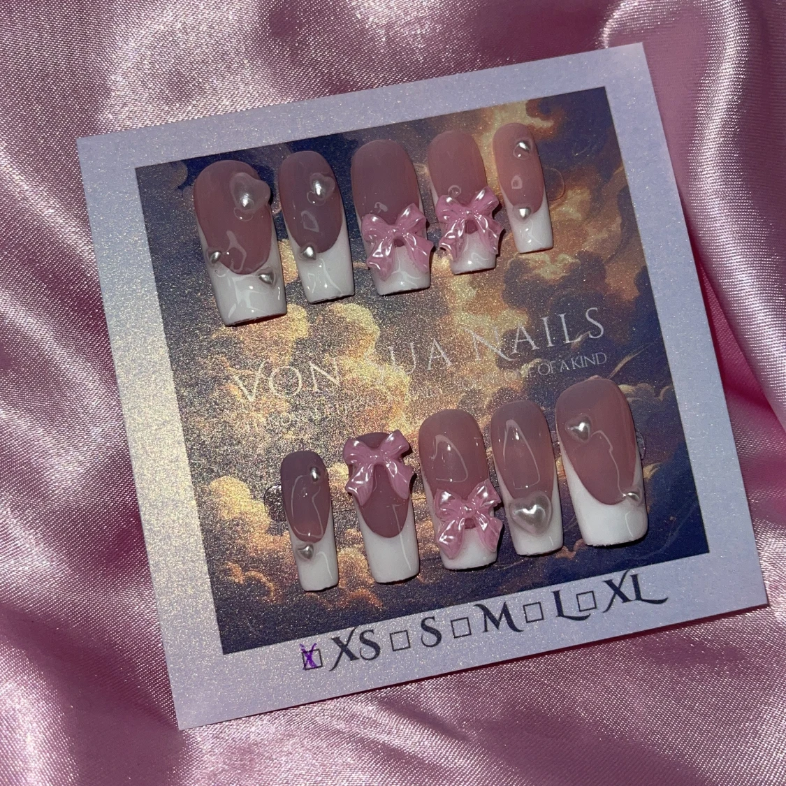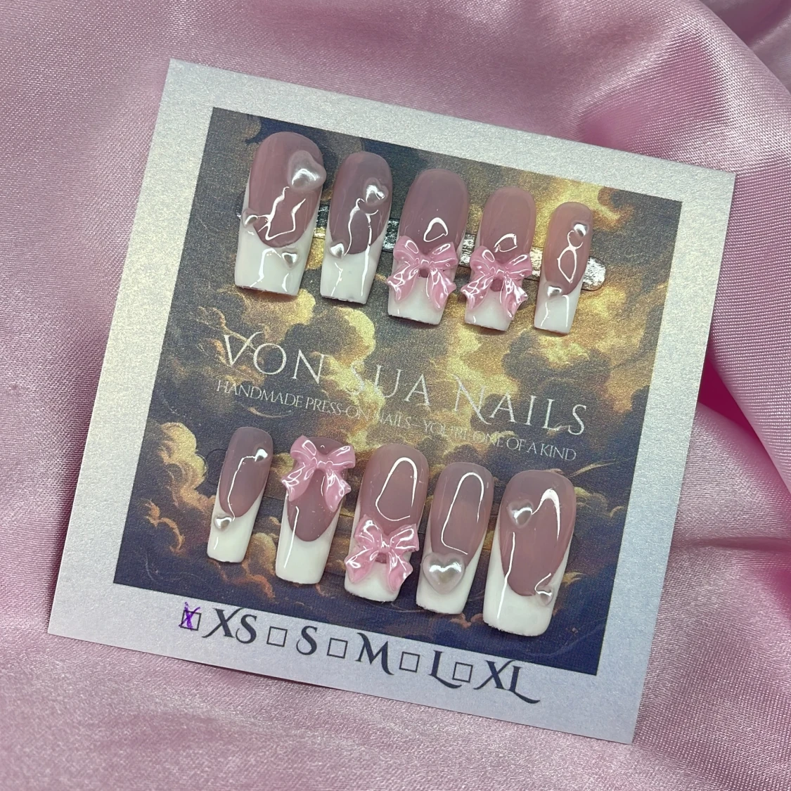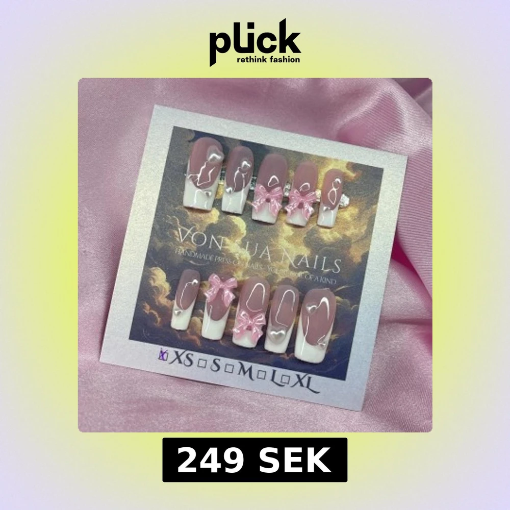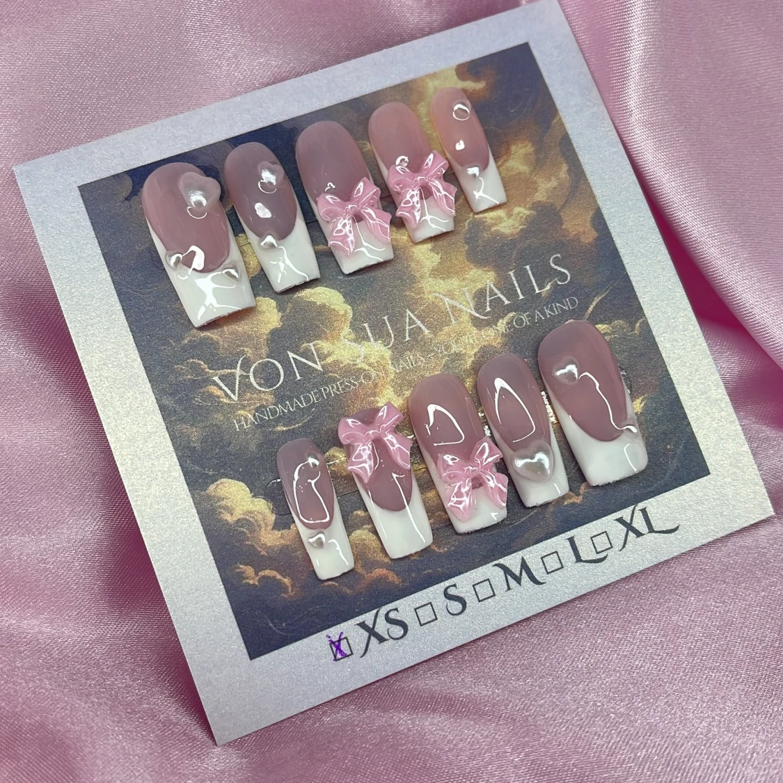 Handgjorda press-on naglar i storlek XS: 14 mm, 11 mm, 11,5 mm, 10 mm, 8 mm, med nude-rosa bas och handmÄlade vita tippar. Dekorerade med 3D rosa rosetter, vita smÄ pÀrlhjÀrtan. Naglarna har en elegant, medium lÀngd och square form. Perfekt för dig som vill ha en söt och trendig look.