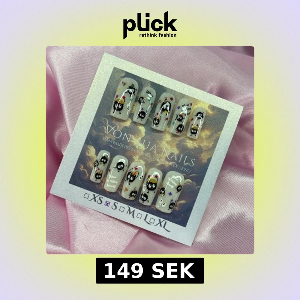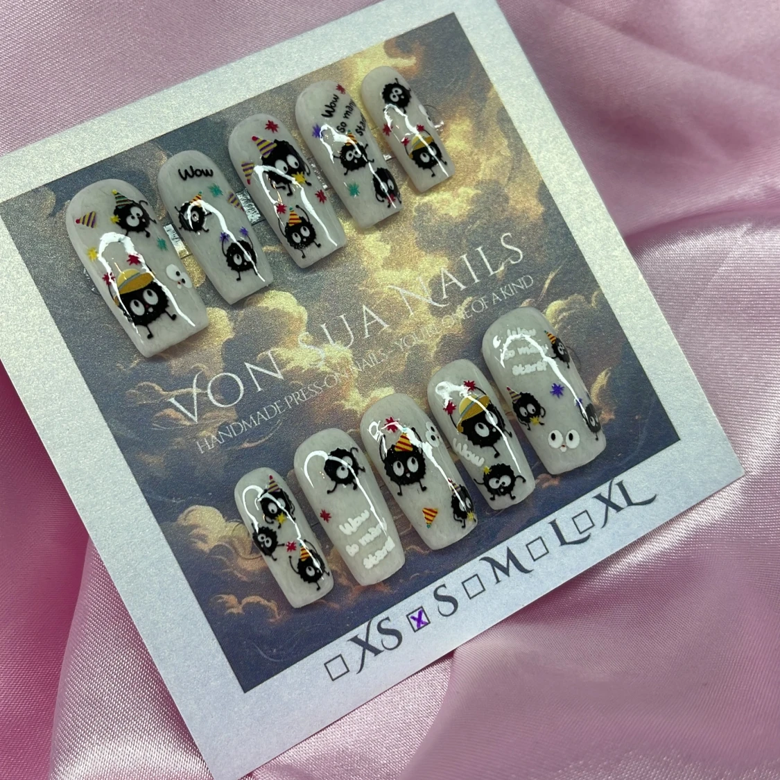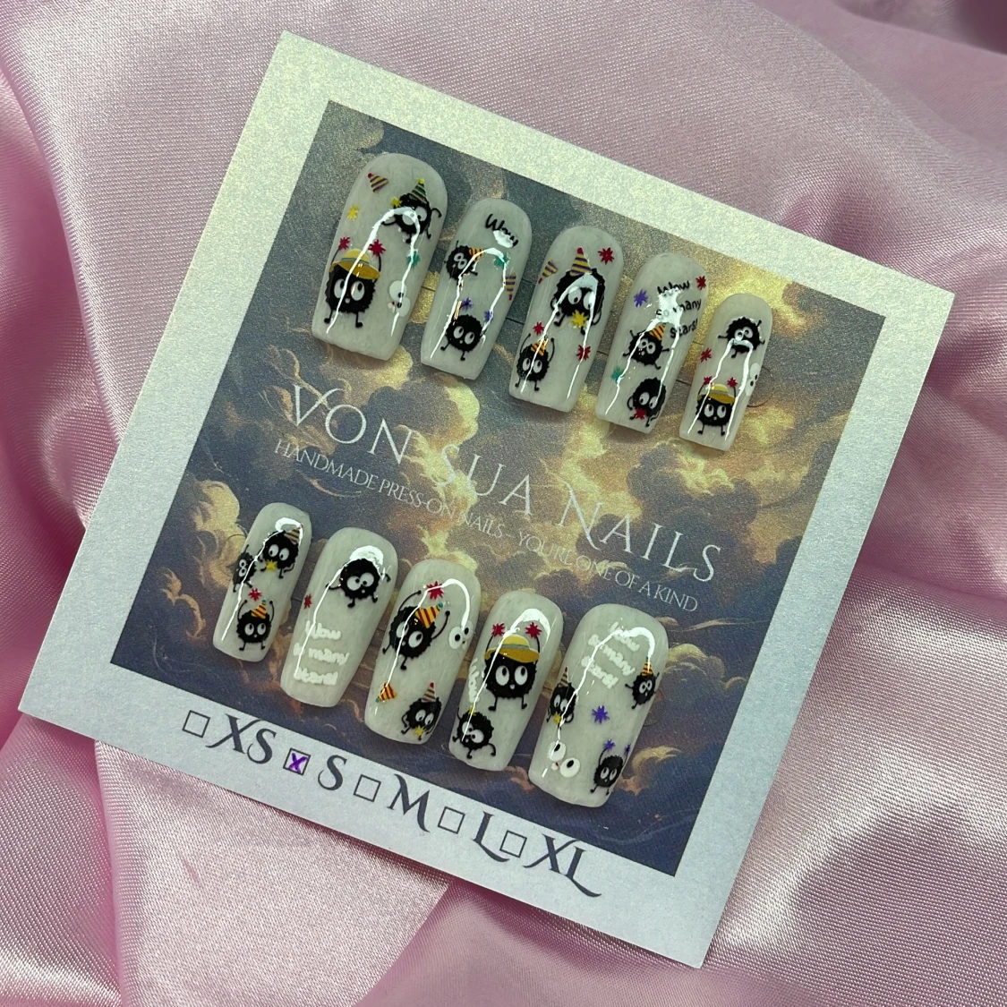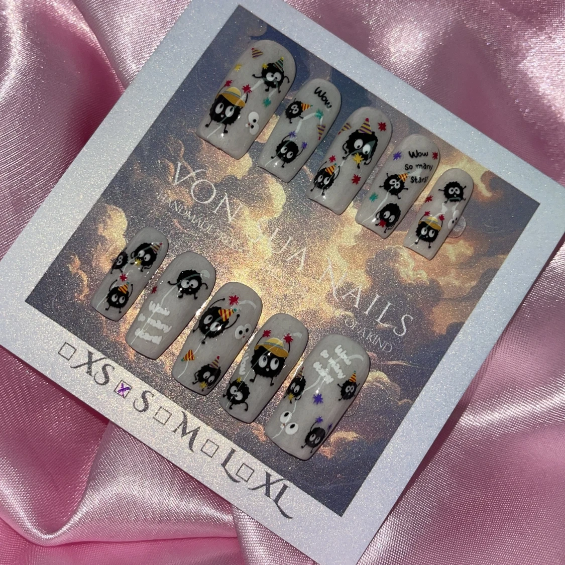 Handgjorda press on-naglar i ljusgrå bas med svarta sotiga figurer, partyhattar och färgglada stjärnor. Naglarna har en medium rak, square form och detaljer i vitt, gult, rött och lila. Söt och lekfull design i storlek S: 15 mm, 11,5 mm, 12 mm, 11 mm, 9 mm