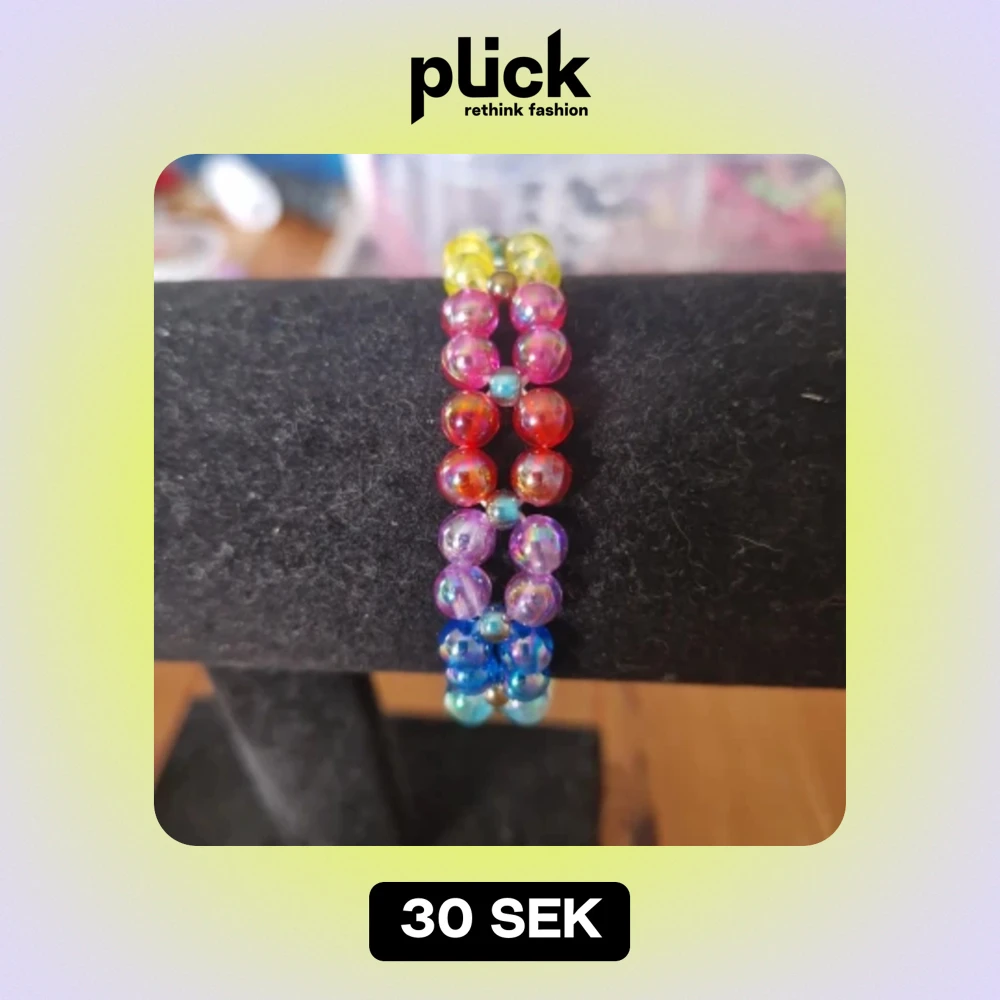 Pärlarmband i regnbågens färger. Dessa pärlor ger ett fint lyster och gnistrar i solen. Omkrets 18 cm Frakt 18:- Är du intresserad av flera armband samfraktar jag givetvis