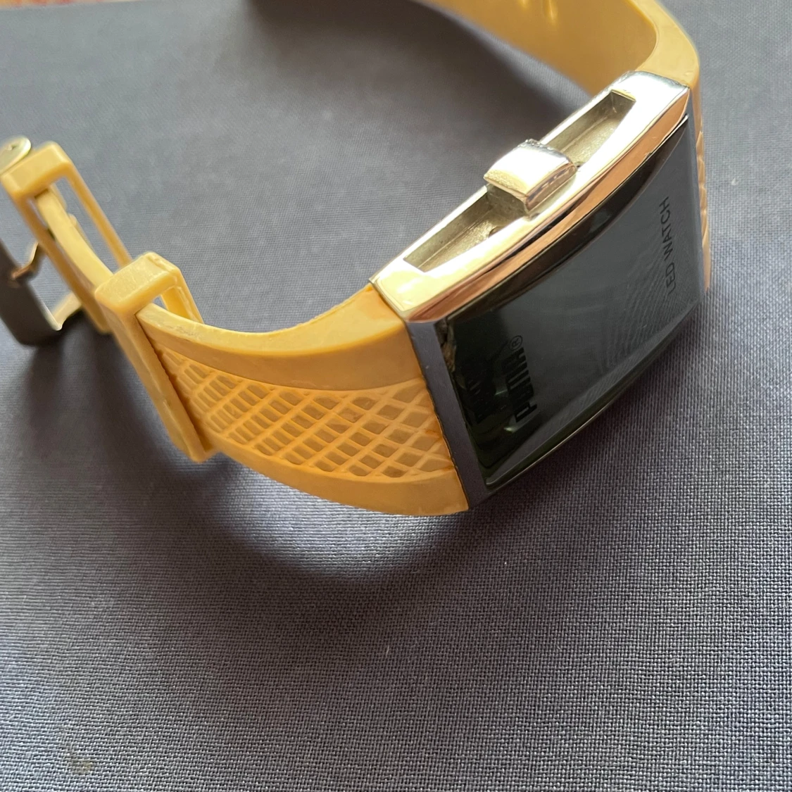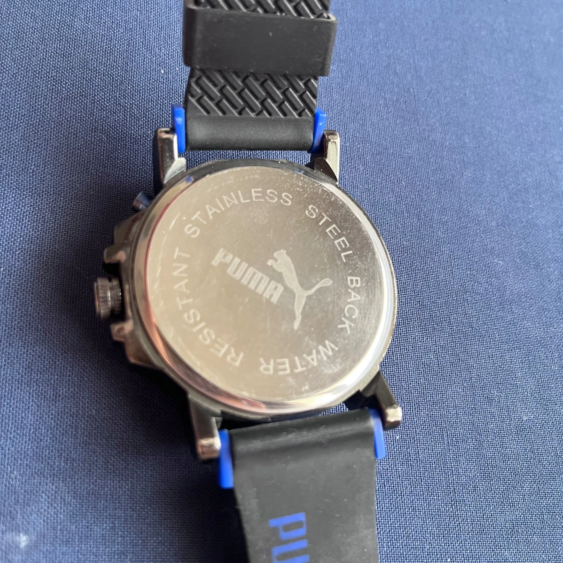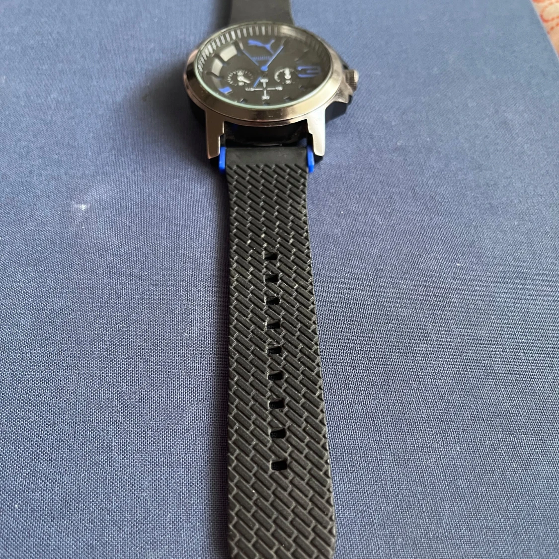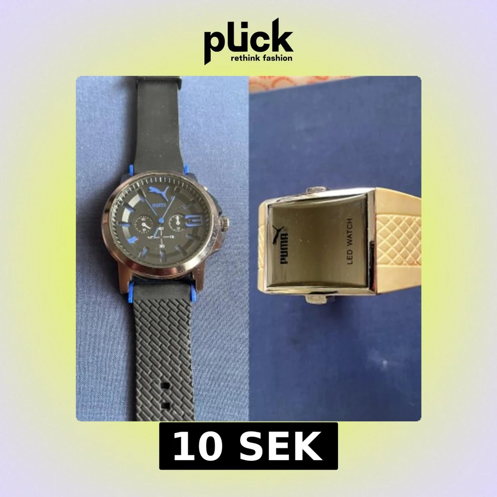 Säljer två snygga Puma klockor! En har svart och blå urtavla med sportig look som behöver batteri,rund boett i silver och svart mönstrat gummiband. Den andra är en LED-klocka med gul gummirem och rektangulär boett i silver och fungerar inte alls. Båda har coola detaljer och passar dig som gillar streetstyle.