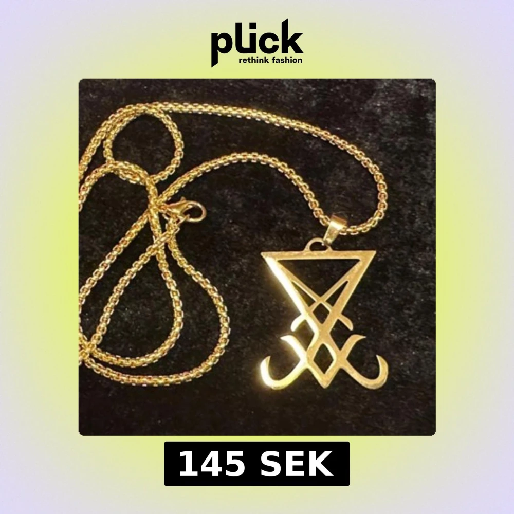 A unique and powerful necklace featuring the Sigil of Lucifer – perfect for those who appreciate alternative, goth, or occult fashion. The pendant is crafted from gold-toned stainless steel and measures approximately 4.5 × 3 cm. It hangs from a durable 60 cm snake chain that is both sturdy and comfortable to wear. The chain is secured with a lobster clasp. The Sigil of Lucifer is a symbol with a long and mysterious history, often associated with freedom, strength, and individuality. Bundle!