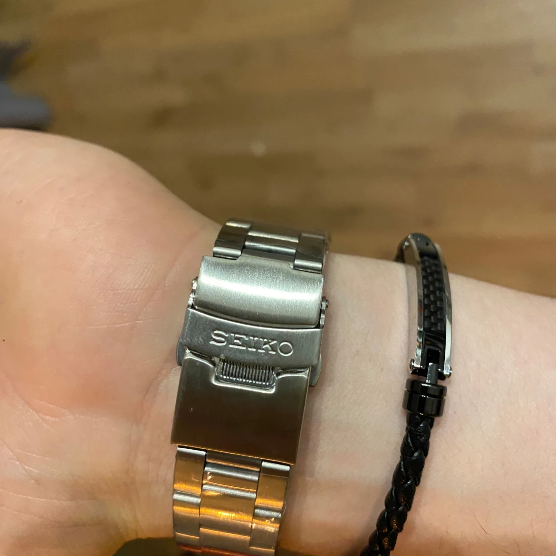 Snygg Seiko herrklocka med silverfärgad länk och blå detaljer på boetten. Urtavlan är vit med tre mindre svarta subdials och tydliga markeringar. Perfekt för den som vill ha en stilren och sportig look. Urverket är quartz.