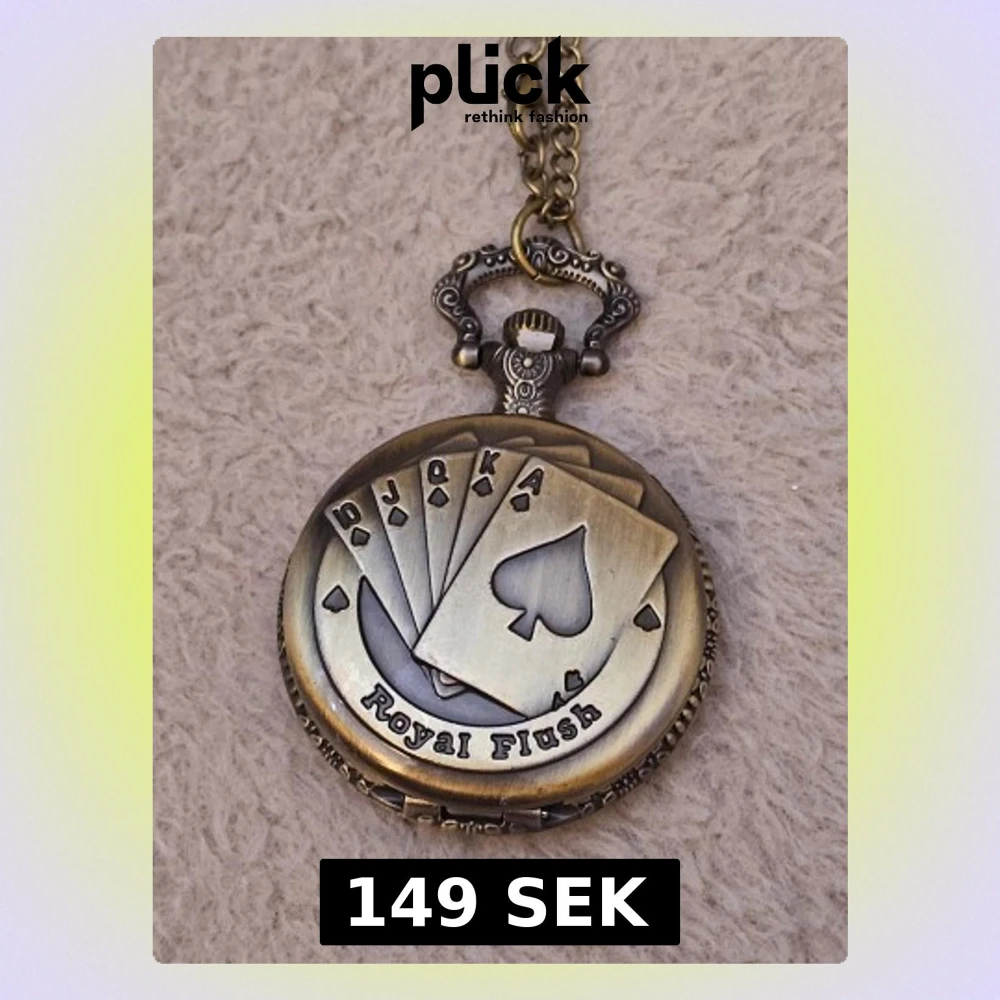 Ett vackert fickur med ett detaljerat motiv av en Royal Flush på framsidan. Baksidan har ett dekorativt blommönster. Uret har en vit urtavla med svarta siffror och en quartz urverk. Inkluderar en matchande kedja i antik bronsfärg. Batteri ingår Stl: diameter 4,7 cm Höjd: 6 cm Kedjans längd 80 cm