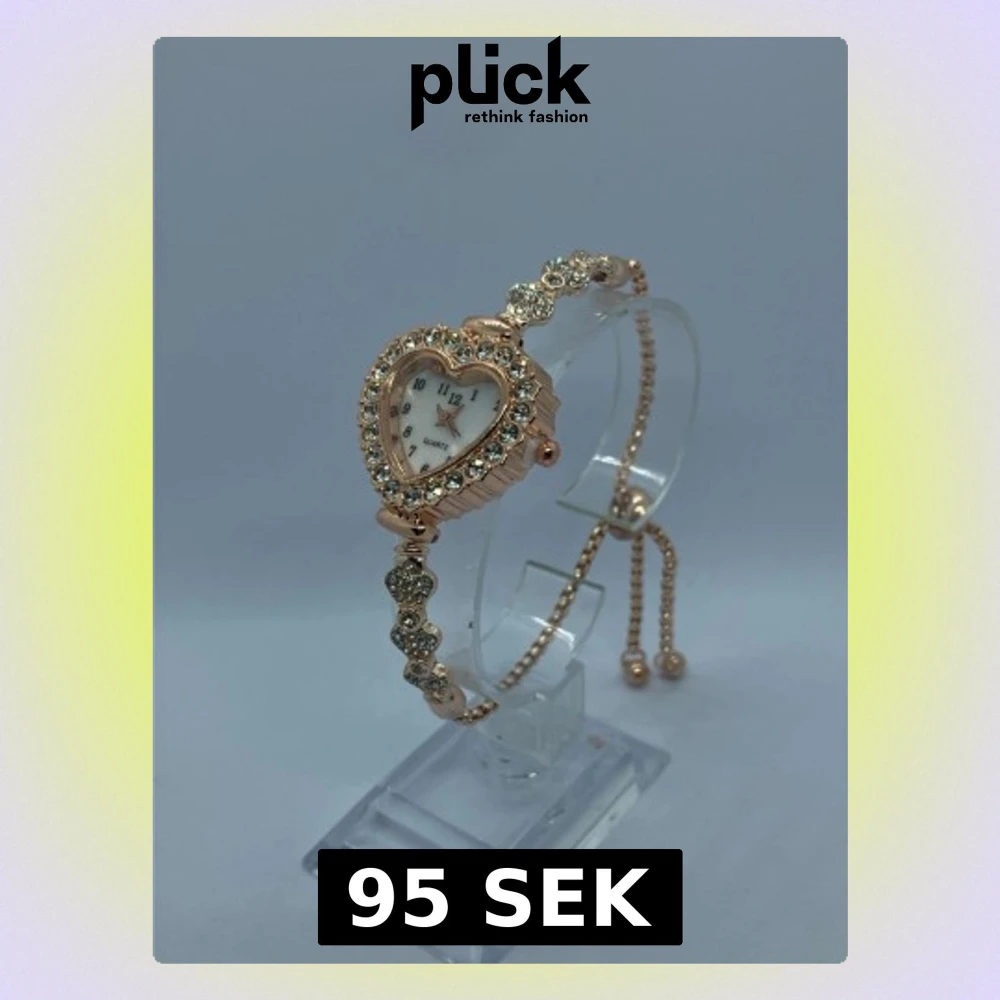 Säljer en unik armbandsklocka i roséguld med hjärtformad urtavla. Klockan är dekorerad med glittrande stenar runt urtavlan och på armbandet. Justerbar kedja med små kulor i ändarna. Perfekt accessoar för dig som gillar detaljer och bling.rostfritt stål med ett nytt batteri