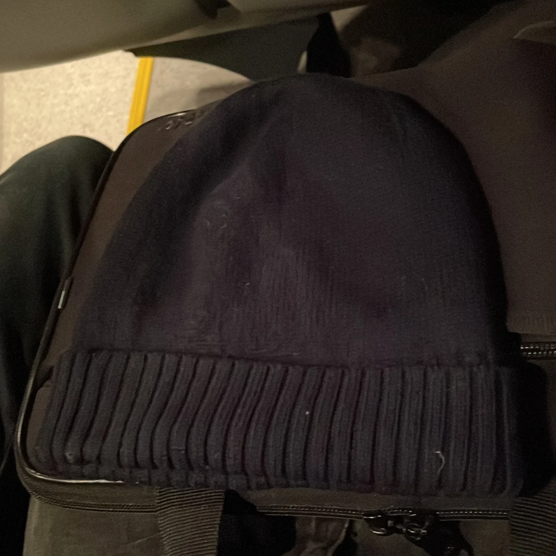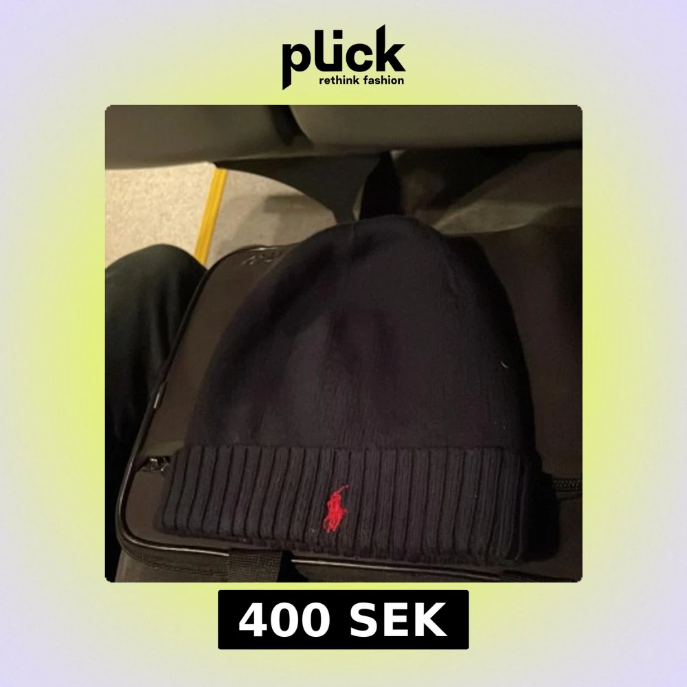 Snygg mörkblå mössa från Ralph Lauren med röd broderad logga framtill. Den är ribbad vid kanten och perfekt för kyliga dagar.