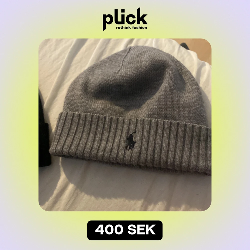 Två snygga stickade mössor från Ralph Lauren. Den ena är grå med en svart broderad logga, och den andra är svart med en röd broderad logga. Perfekta för höst och vinter, håller dig varm och stilren. Passar både till vardags och lite finare tillfällen. 400 för båda 250 styck