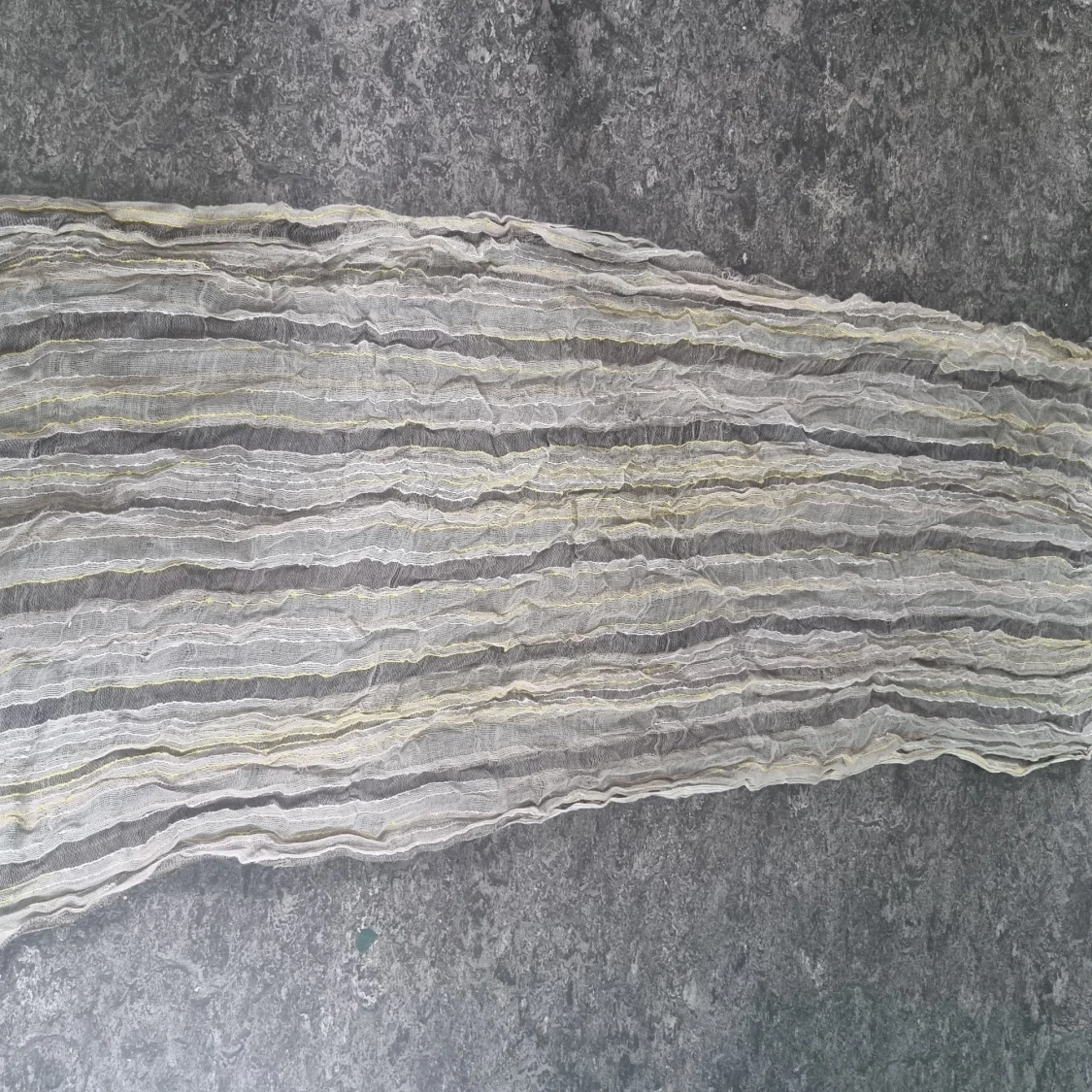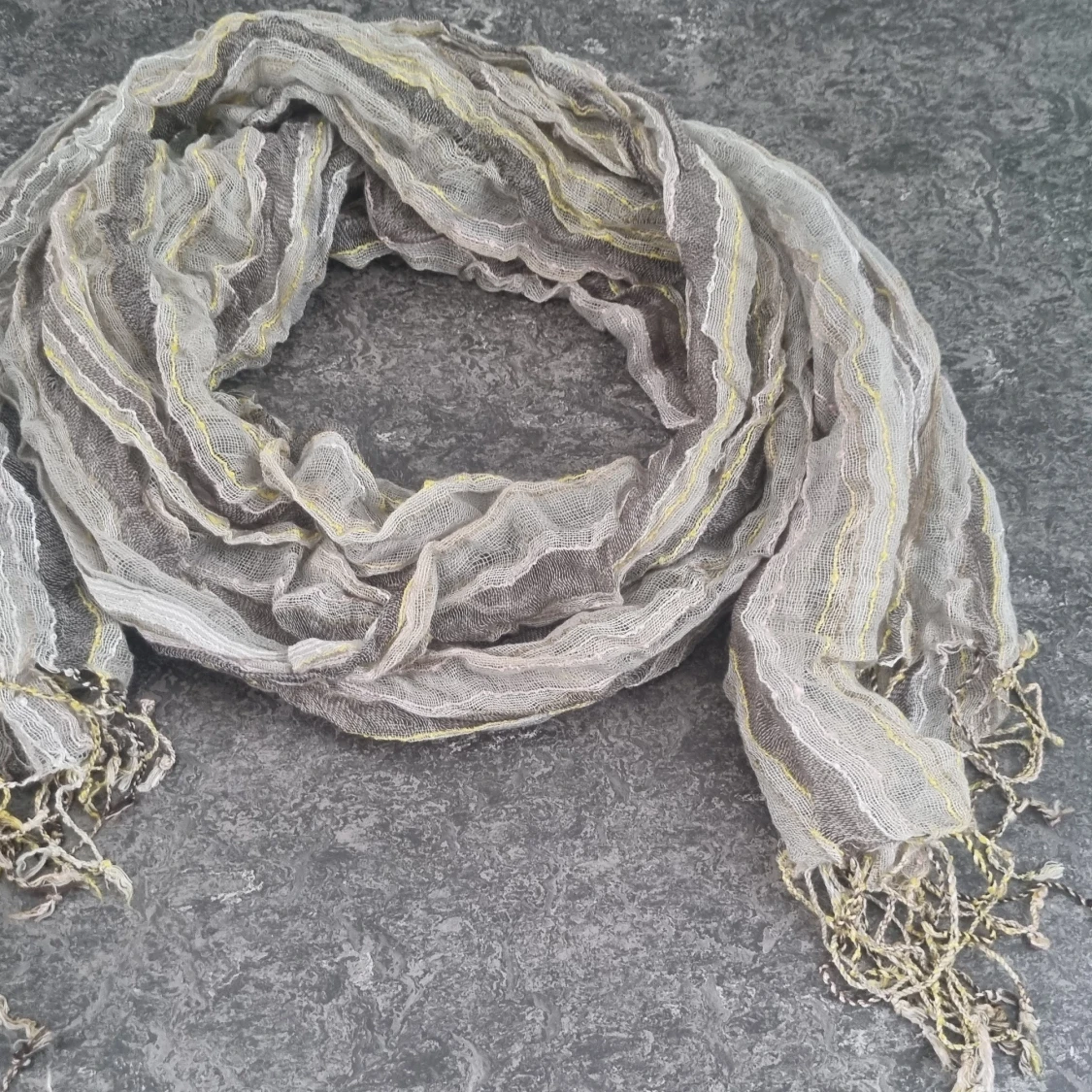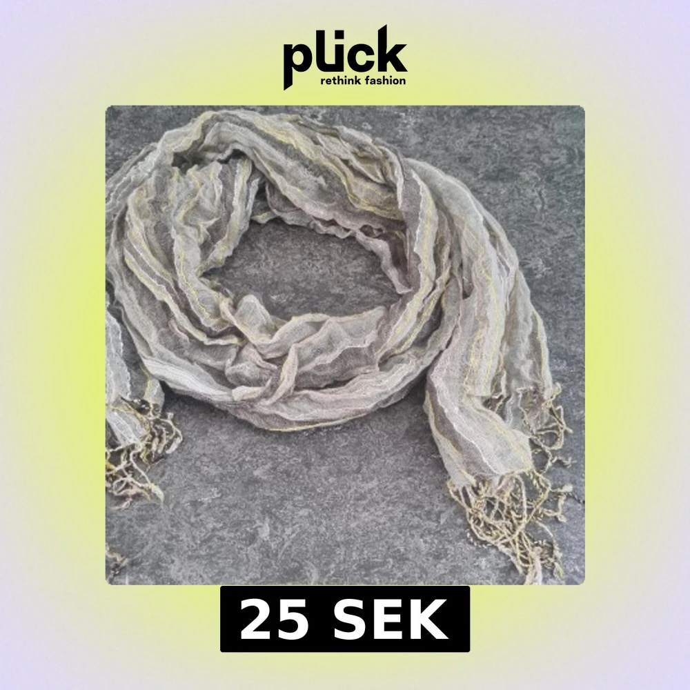 Säljer en tunn och luftig scarf med randigt mönster i grå, beige och grön ton. Materialet är lätt och transparent, perfekt att slänga runt halsen för en chill look. Fransar i ändarna ger extra vibe. Passar dig som gillar att mixa lager och färg.