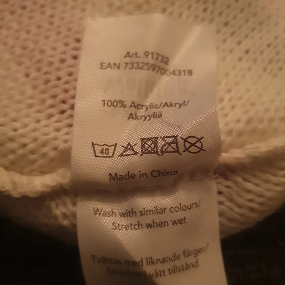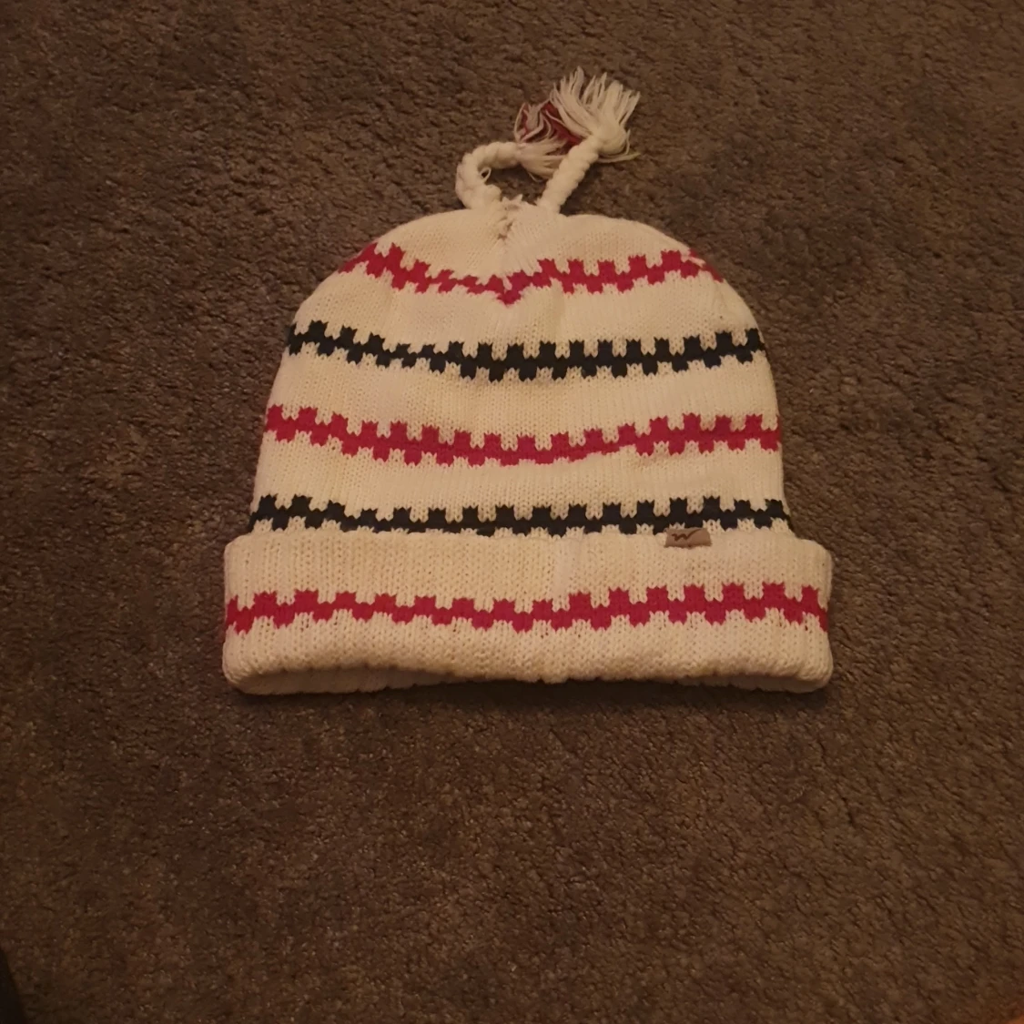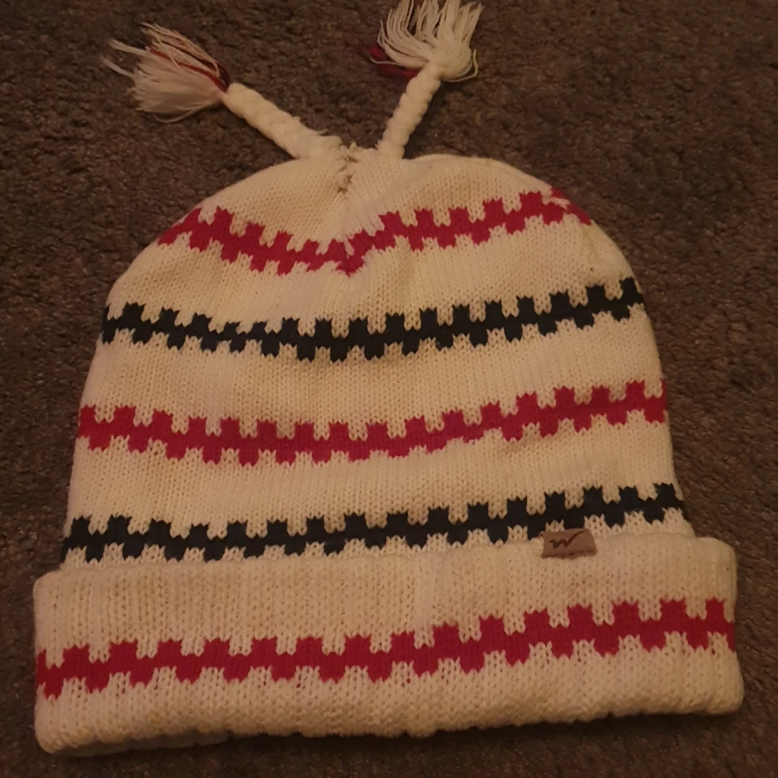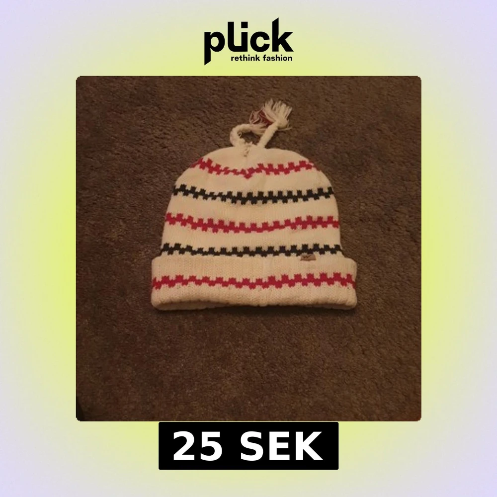 Säljer en vit stickad mössa med röda och svarta ränder. Mössan har uppvikt kant och två flätade tofsar på toppen. Tillverkad i 100% akryl, perfekt för kalla dagar. Liten logga på kanten.