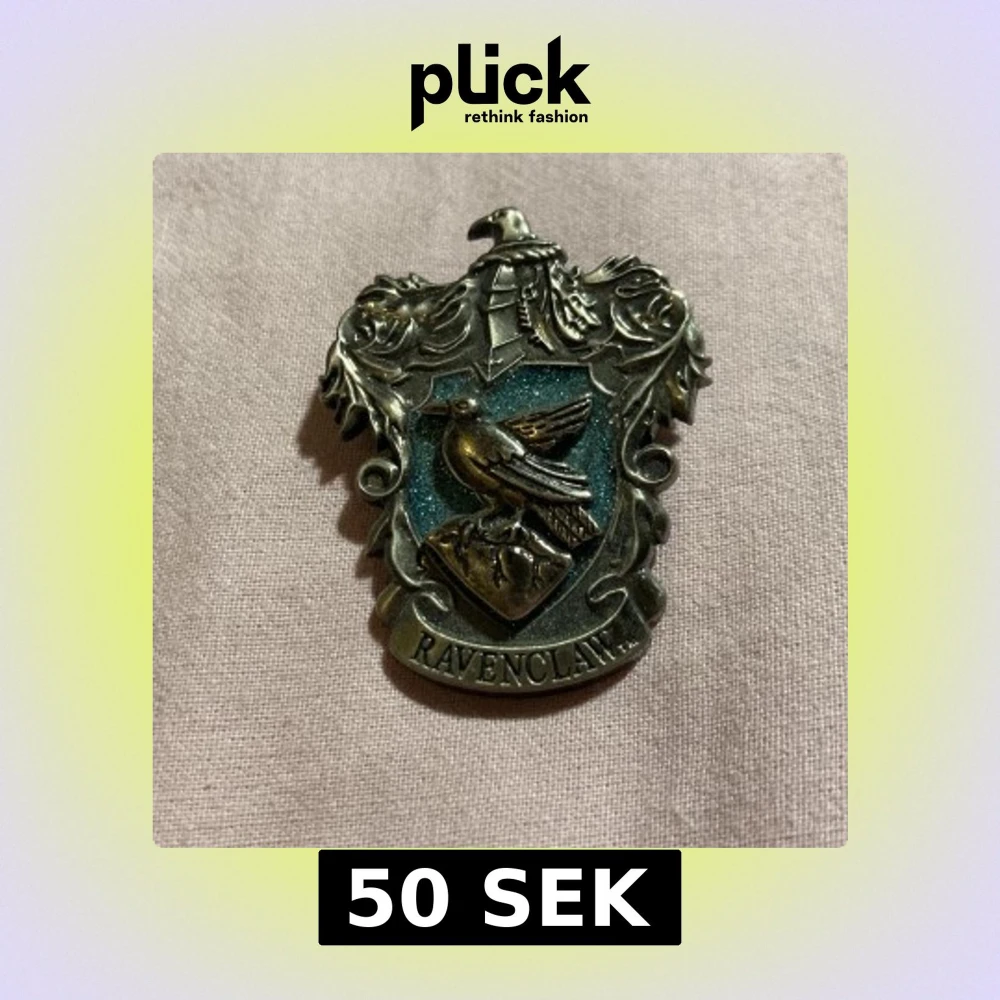 Snygg brosch med Ravenclaw-emblem från Harry Potter. Designen har en fågel och en trollkarlshatt i antik stil med en blå bakgrund.
