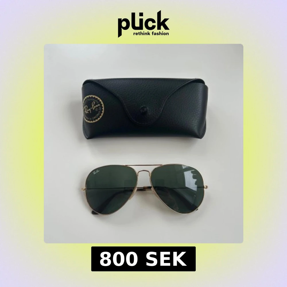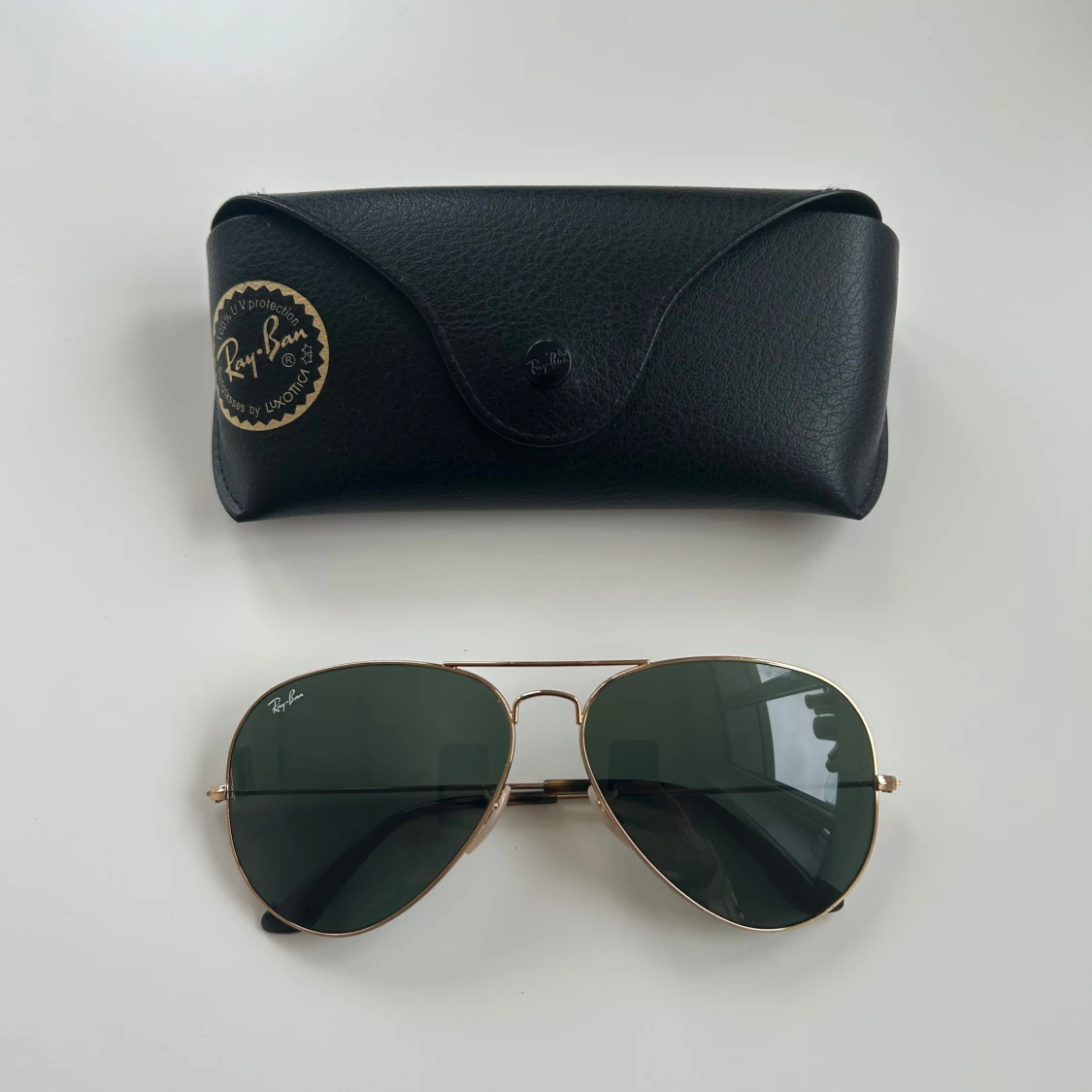 Klassiska Ray-Ban Aviator solglasögon med tunn guldfärgad metallbåge och mörkgråa linser. Glasögonen är sparsamt använda och i felfritt skick. Enda defekten är på fodralet, se bild 3. Original fodralet samt mikrofiberduken ingår. Glasögonen köptes för ett år sedan för 1200 kr!