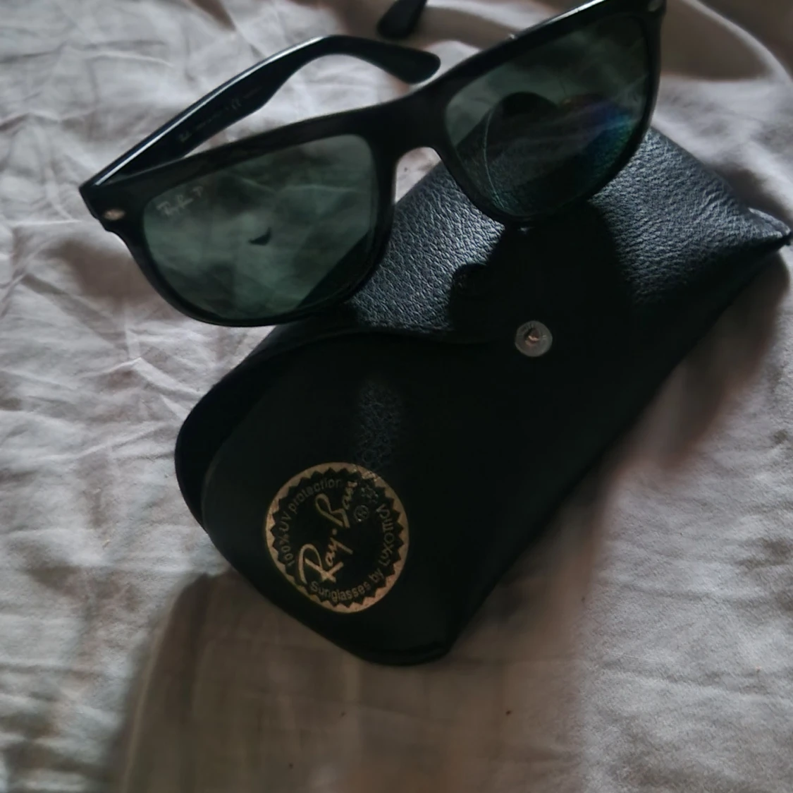 Klassiska svarta Ray-Ban solglasögon med mörka glas och ikonisk form. Säljs med original svart fodral i skinnimitation med Ray-Ban-logga i guld. Perfekta för en cool och tidlös stil.