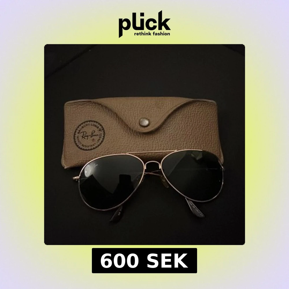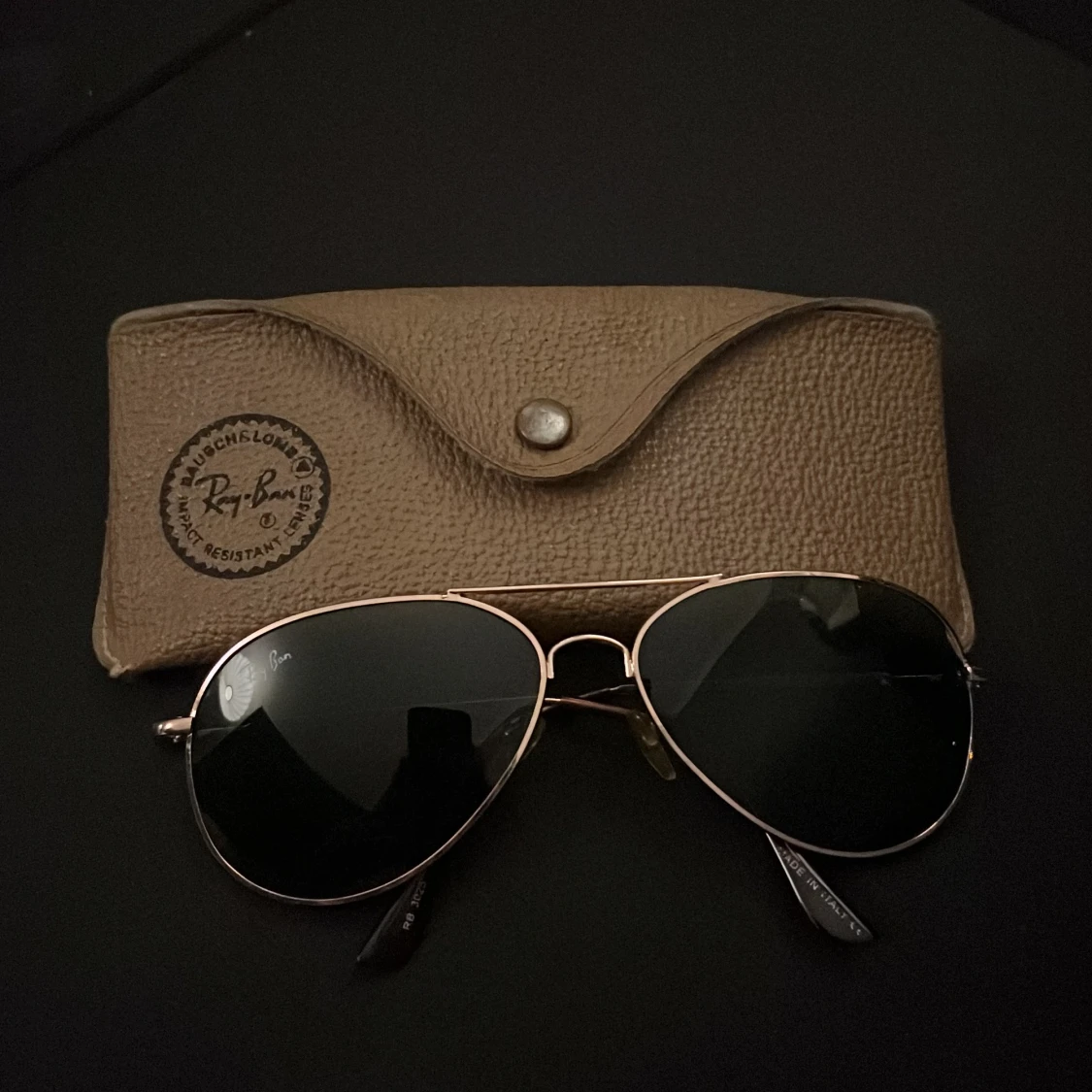 Klassiska Ray-Ban Aviator solglasögon med tunna guldfärgade metallbågar och svarta glas. Snygg pilotform som ger en tidlös vibe. Kommer med original brunt fodral med Ray-Ban-logga. Perfekta för att lyfta vilken outfit som helst.