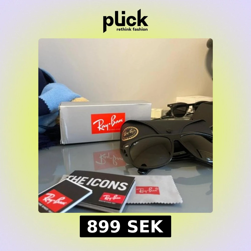 Klassiska svarta solglasögon från Ray-Ban med Wayfarer-form. Glasögonen har mörka linser och diskret Ray-Ban-logga på linsen och skalmen. Tillverkade i Italien och levereras med originalförpackning och putsduk.