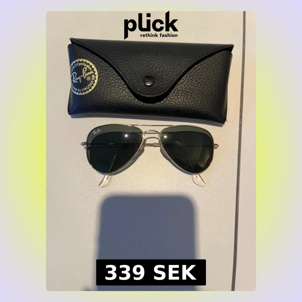 Klassiska Ray-Ban Aviator solglasögon med guldfärgad metallbåge och mörkgröna glas. Kommer med svart Ray-Ban fodral i läderimitation och putsduk. Perfekt accessoar för soliga dagar och tidlös stil.