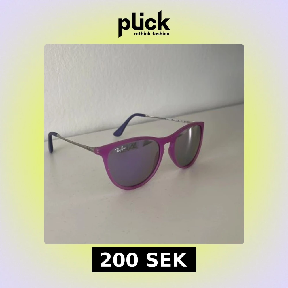 Säljer ett par snygga solglasögon från Ray-Ban med lila bågar och mörka glas. Bågarna har en klassisk rundad form och tunna metallskalmar. Perfekt accessoar för att lyfta din stil. Använda ett fåtal gånger. Barn storlek!!