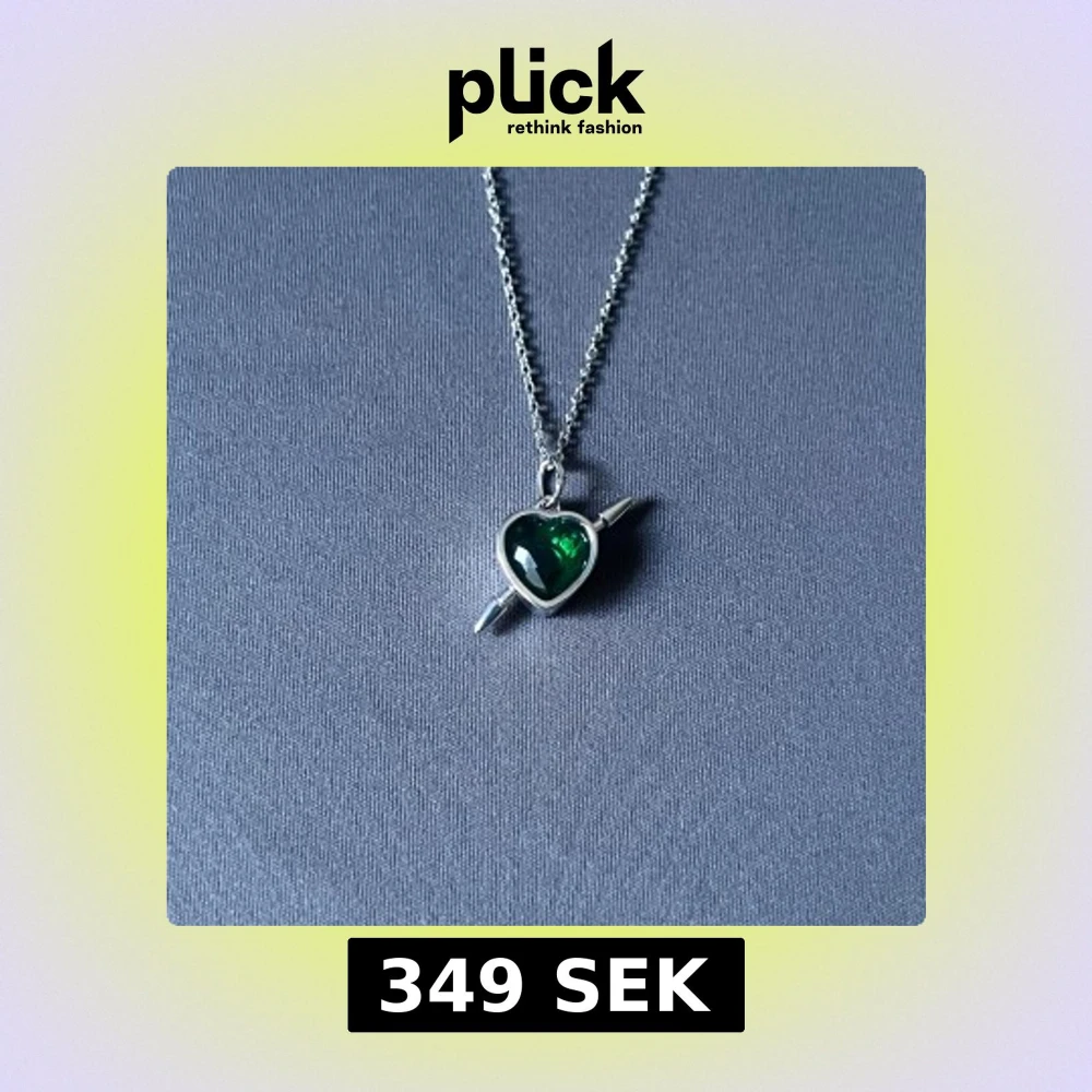 Grönt hjärta med pil. Kedja 50 cm, justerbar. Hängets diameter 0,9 cm